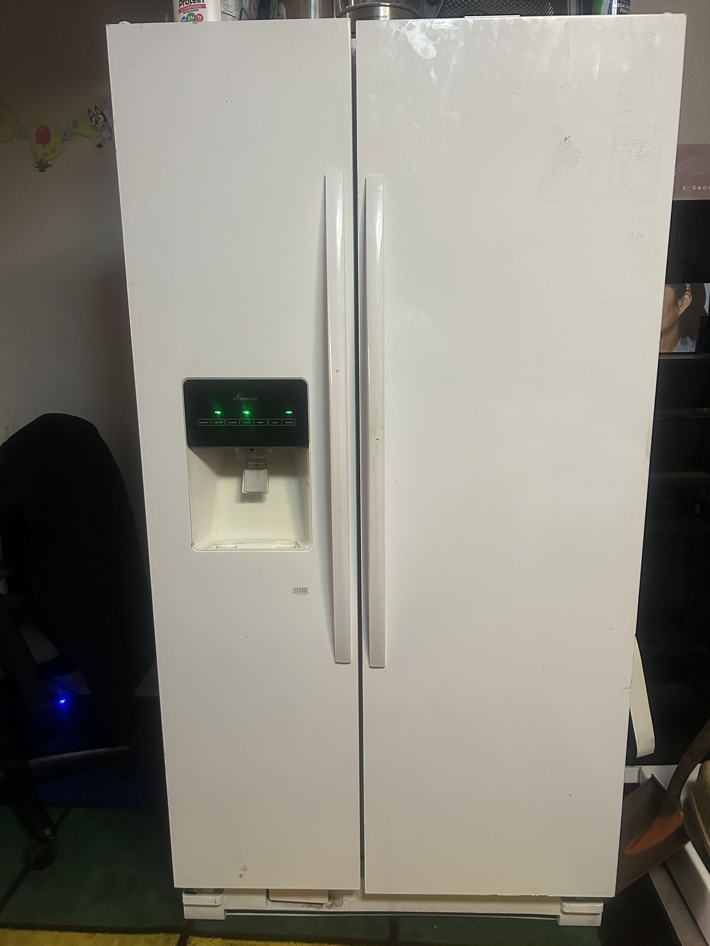 This is a like new refrigerator. It works very well. The dimensions are 68 inches tall, 3 foot wide by 31 inches deep. It is very gently used basically brand new and works perfectly. Has icemaker and water dispenser. Very large refrigerator.