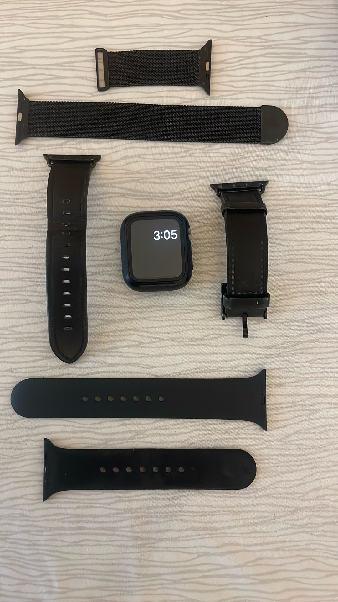 Apple Watch SE (1st Generation) [Cellular + GPS] Size 40mm with 3 bands (one silicone color black, one leather color black and brown, one stainless steel color black). Waterproof screen protector with backing case included. Normal wear. Always had a screen protector on it so there are no scratches on the watch face. In good condition. Flexible on the price.
