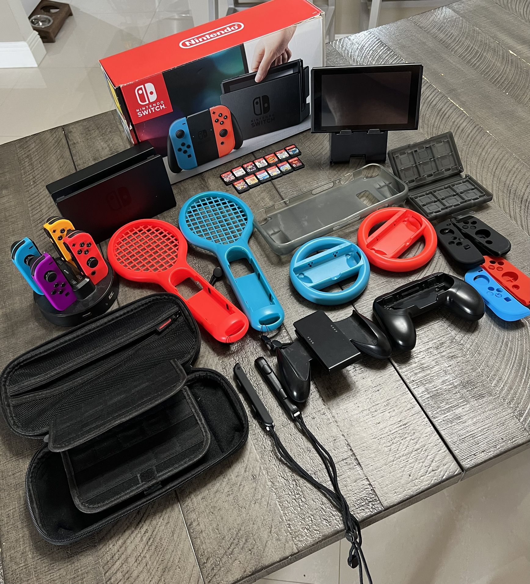 Includes: -Nintendo Switch console (Great Condition) with Original dock set, power adapter and box. -13 Games - 2 Pairs of Joy cons -Console stand -Gray console hardshell protective case -Console carry case (Holds 20 games & zipper pouch for additional carries) -Games case (Holds 16 games) -Charging Station (Hold 4 joy cons) -2 Racket attachments for included games -2 wheels for included games -2 Joy con wrist straps -4 joy con cases -1 duel Joy comfort grip - 1 single joy con comfort grip