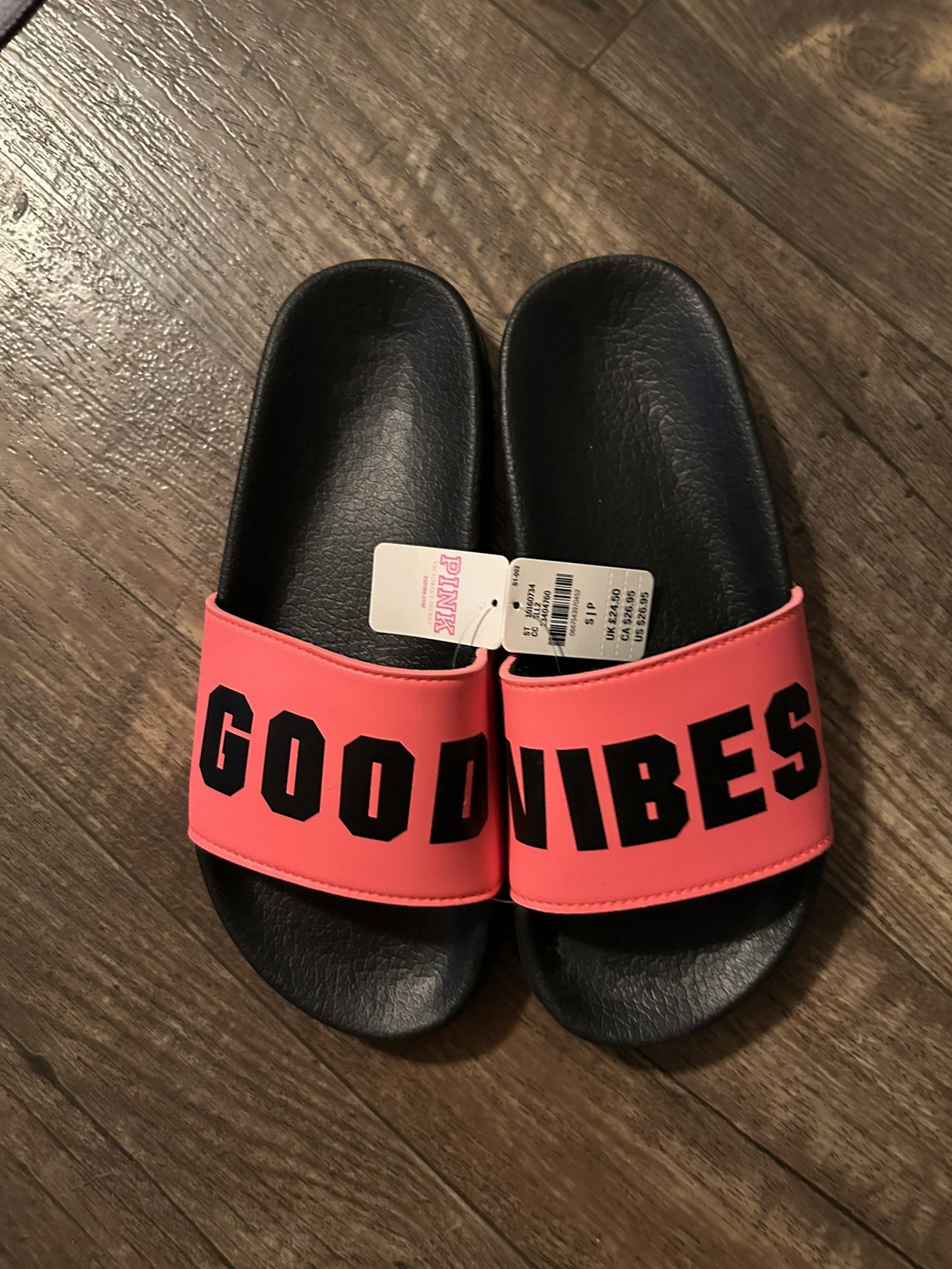 VICTORIA'S SECRET PINK NEON CORAL GOOD VIBES SLIDES FLIP FLOPS SANDALS SLIPPERS SMALL