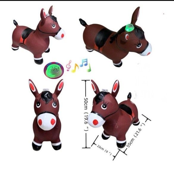 Brown inflatable donkey toy that comes with sound and lights.