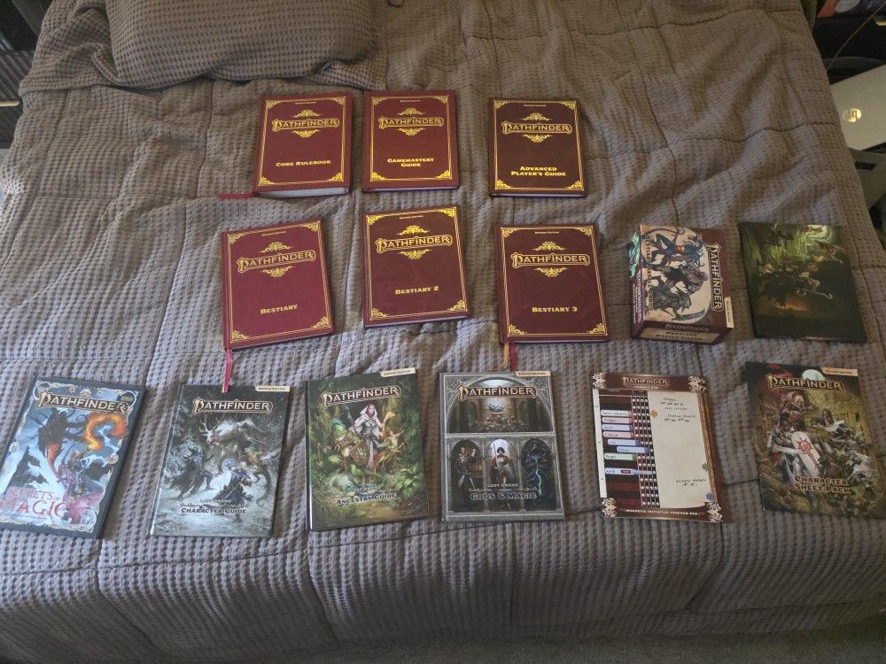 Core Rulebook (Special Edition), Gamemastery Guide (Special Edition), Advanced Players Guide (Special Edition), Bestiary (Special Edition), Bestiary 2 (Special Edition), Bestiary 3 (Special Edition), Bestiary Battle Cards, Game Master Screen, Secrets of Magic, Lost Omens: Character Guide, Lost Omens: Ancestry Guide, Lost Omens: God's and Magic, Combat Pad, Character Sheet Pack. All my books are in excellent condition. They are looking for a good home. This collection would be excellent for anyone who wants to jump in to the world of table top role-playing games feet first. Or for someone who is a veteran in the table top gaming community.