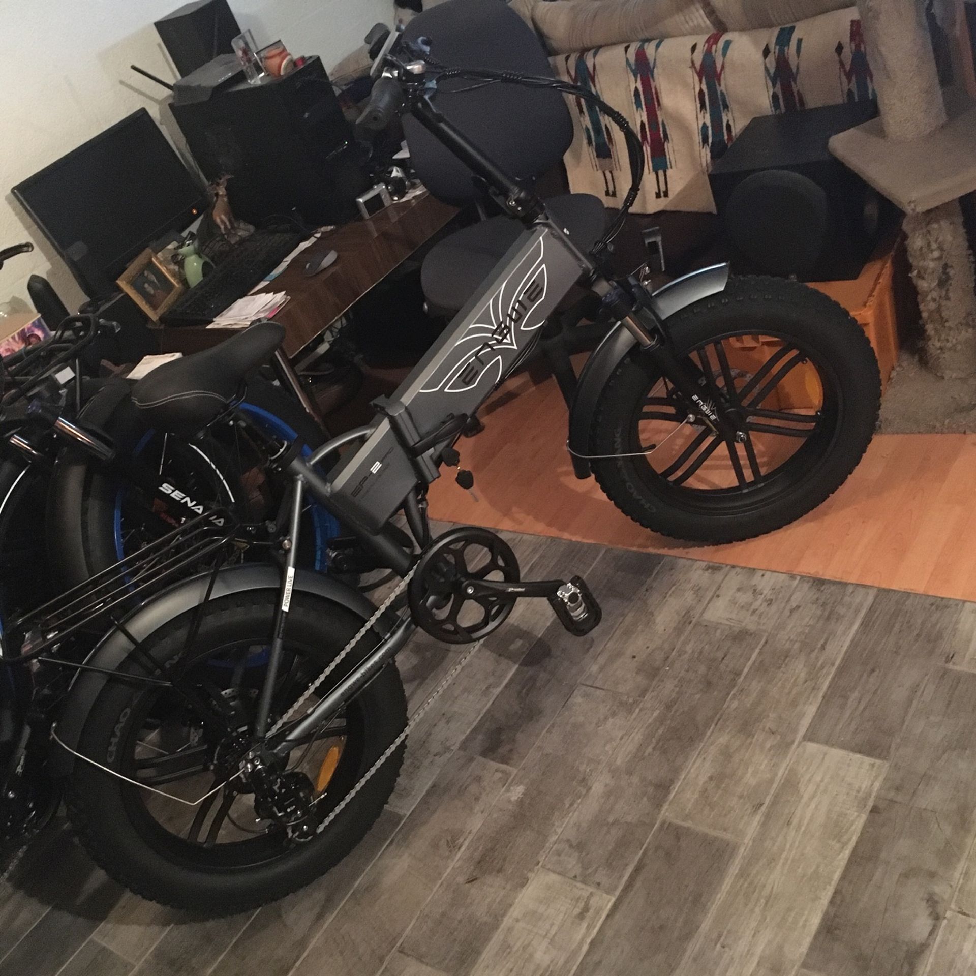 Well here is that full size, same length from axle to axle as my large MTB bikes and not a toy, cheap little no power Toy, like so many little folding bikes!!! These have an insane 75 mile range!!! I sell these super awesome looking monster folding E-Bikes for all height people that you’ve been waiting for and have them in stock always!!! 750 watt brushless motor and 13 amp hr, 48 volt Lithium-ion super batteries that drive these to super fast 28/30 mph and crazy 75 mile max range!!! These beautiful bikes are full length, full size heavy duty folding bike and come in black with red accents and gunmetal gray with black accents and both have awesome mag wheels!!! These are big but light at 74 lbs and only 26 inch low stand over height for people who are 5’2 to 6’6! Built and tuned to perfection by me and my 40 yrs master bike builder exp. 7 speed Shimano rear gear, disc brakes, 20 inch by 4 inch knobby tires beautiful paint and graphics plus chrome strips on fenders Awesome Mag Wheels , super soft seat, led readout and led front and rear tail lights and brake lights that work when front or rear brakes are applied, you don’t see that ever hardly, only here with these Engwe bikes also carrying rack ect, ect!!! The fastest and most powerful folding ebike for the money period, also the best looking and biggest too! I Give The Industry Leading, 5 years tuning or any adjustments if needed. Also 1 year Warranty on everything from Engwe that I handle for you if needed. Free demo rides too so feel these monsters for yourself with no pressure to buy at all!!! If interested just shoot me a message and thx soooooo much for looking, own the streets and No gas waisted!!!