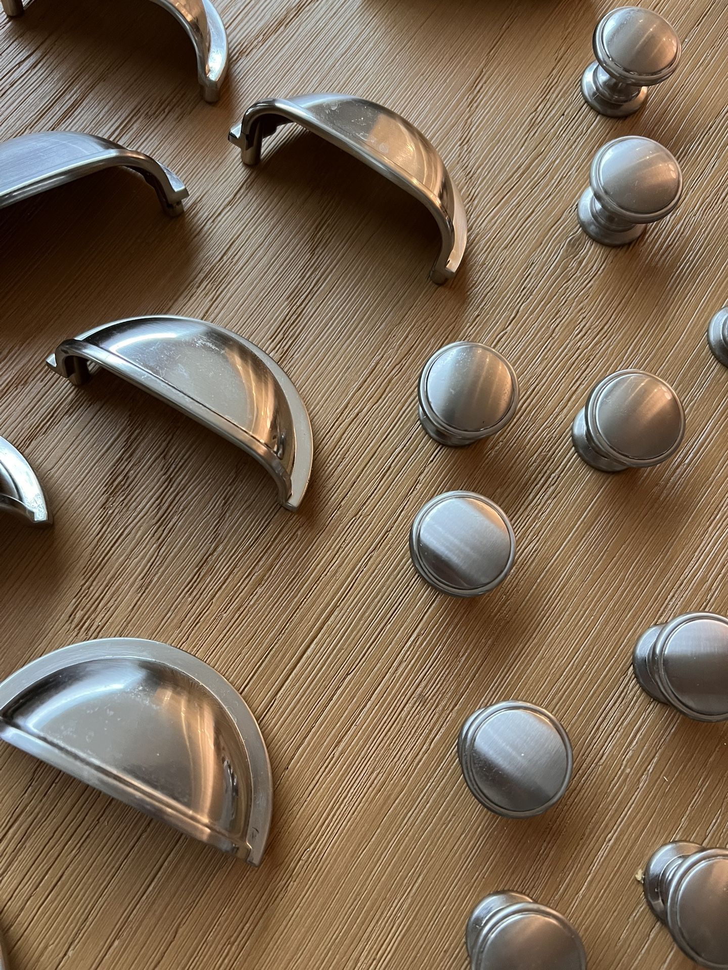 Changed out our existing hardware, so not sure where these are from but there are 32 knobs and 9 pulls. Price is for everything. Dimensions: Knobs - 1.25” diameter Pulls - 3” distance from holes. Total width is 3.5”