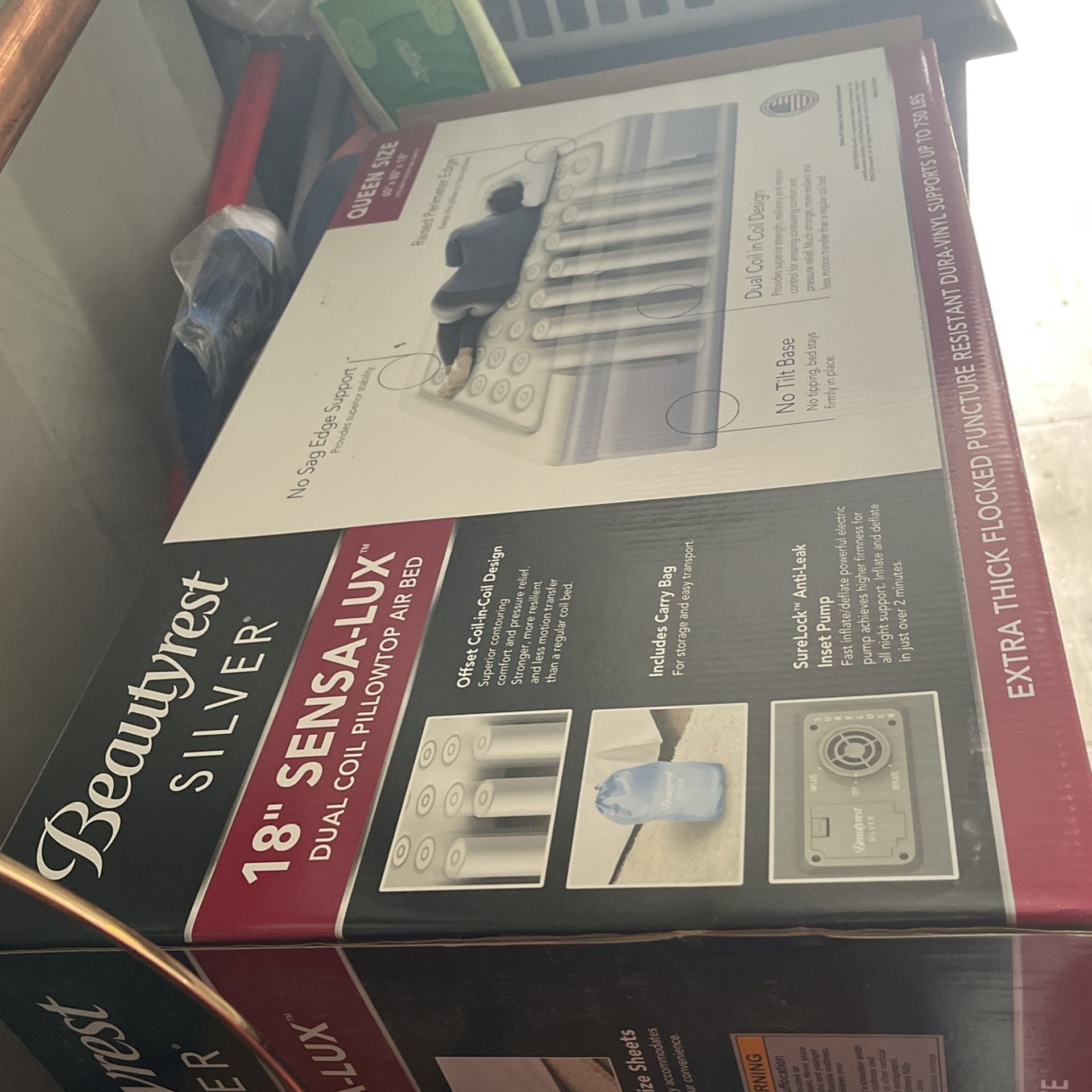 18 inch Beautyrest air mattress pump included. When I got a refund at the store the clerk said she had to open the box in order to give me a new mattress, it’s store policy but that’s why it’s opened never used.