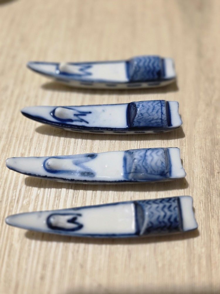Set of 4 Japanese ceramic chopstick rests. Hand-painted blue & white design. Great condition. Perfect for dining or décor.