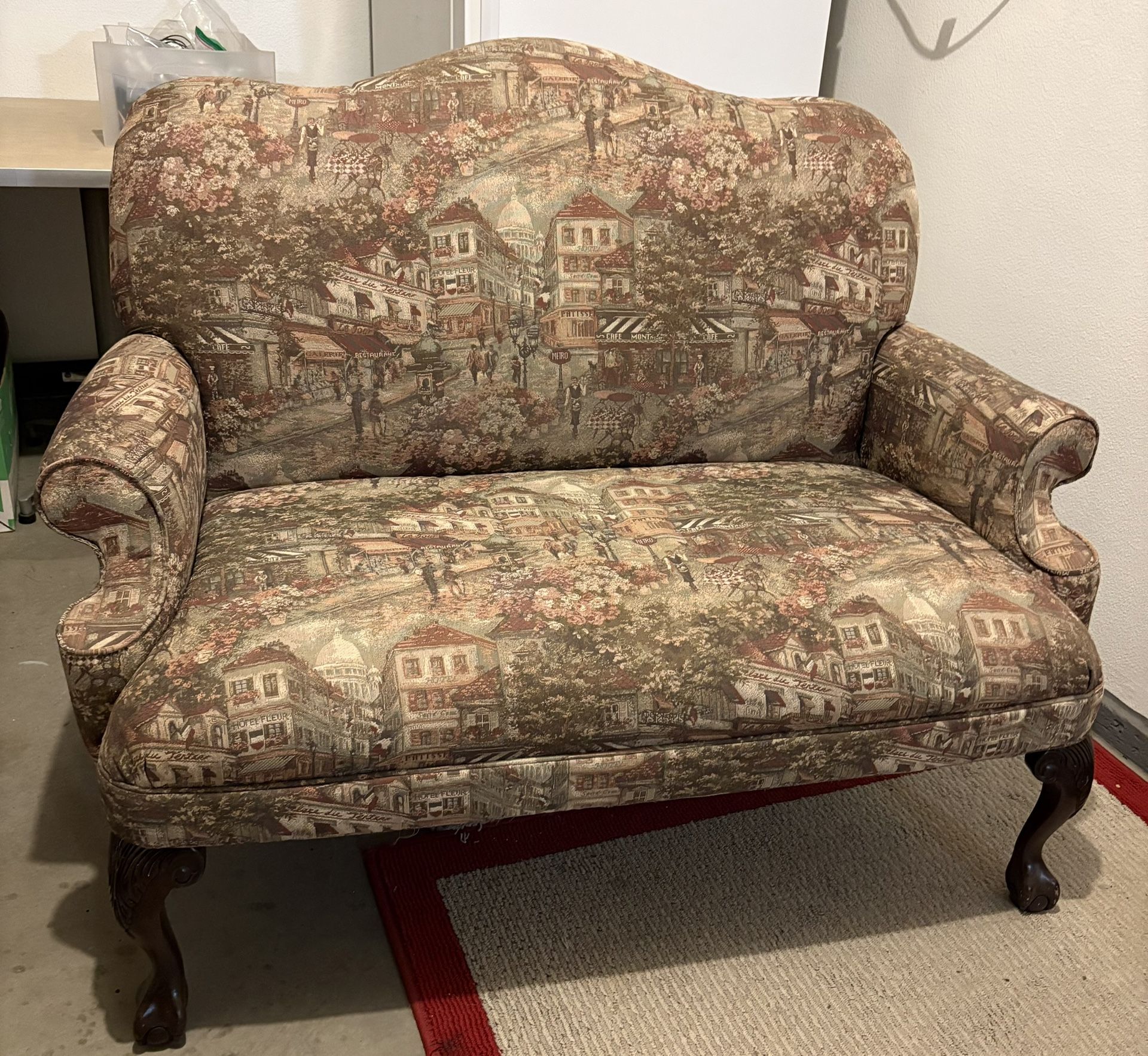 Antique love seat couch with sturdy wooden legs. Used but in good condition