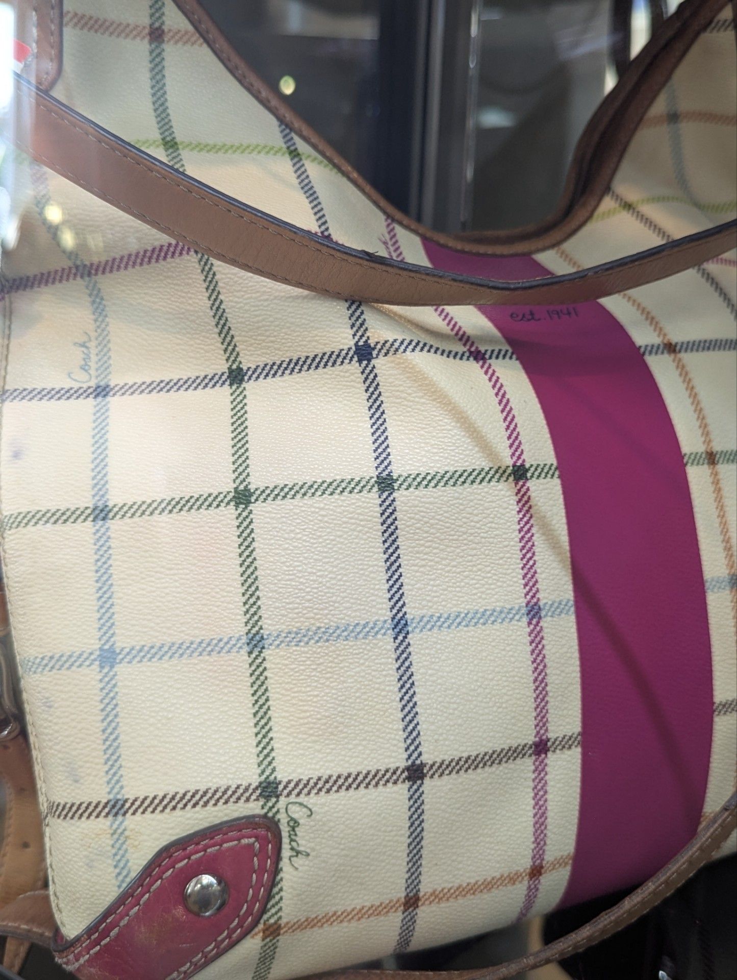 Authentic Coach shoulder bag. Has a cool plaid pattern with lots of colors like blue, green, and brown on a cream background. A bright magenta stripe runs down the middle and matches the leather accent. Brown leather straps. 'est. 1941' is on there too.
