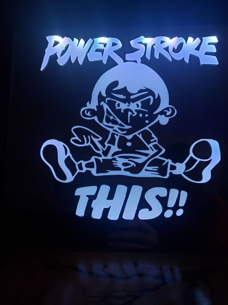 Power Stroke this etched lighted mirror. Backlit with L.E.D.s, changes 16 colors and 4 modes. Flash,strobe,fade,and smooth. Comes with remote. USB plug in. Can be plugged into any phone charger, car usb, back of most TVs or even a portable battery charger. Makes a fun addition to any room. 12x12 mirror