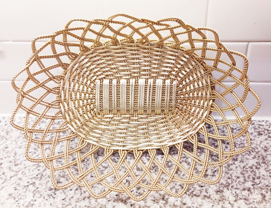 Golden, metal, bread basket Base: 10x7" Widest top: 10x13"