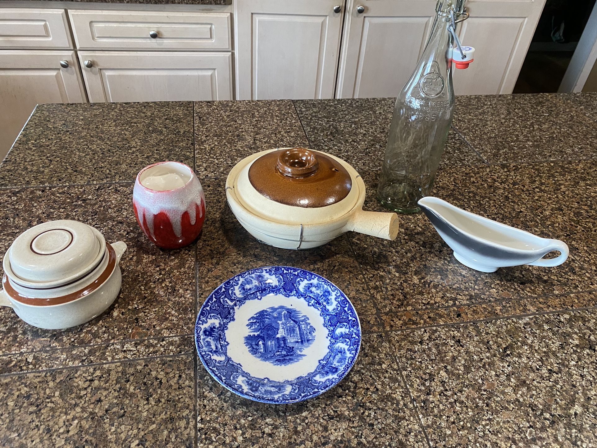 Blue and white plate Petrus Regout & Co maastricht abbey 6 1/2 plate $5 Chinese clay pot or sand pot with lid and wire frame. $15 Wallace china gravy boat $5 Japan Yamaka Contemporary Chateau Sugar Bowl with lid stoneware. $5 Geyer Freres 1895 glass mason bottle with bottling lid. $5 Red and white ceramic cup. $3