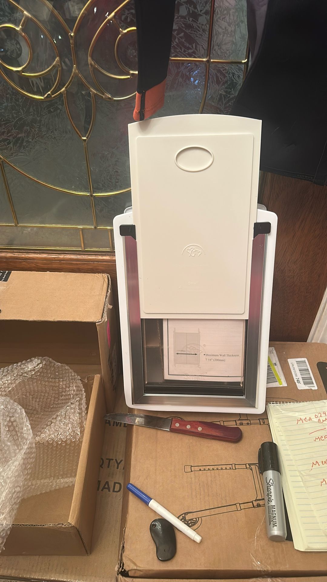 75$ retail. Decormax pet Door for Wall, Energy Efficient Pet Door with Steel Frame, Telescoping Tunnel, Double Magnetic Flaps and Two Sliding Lock Panels, Easy to Install, white Small This is a Decormax Steel Dog Door for Wall. Features a telescoping tunnel that adjusts to fit walls from 4-8 inches thick. Has double magnetic flaps for a tight seal against drafts. Includes two sliding lock panels to control pet access. Constructed with a durable steel frame.