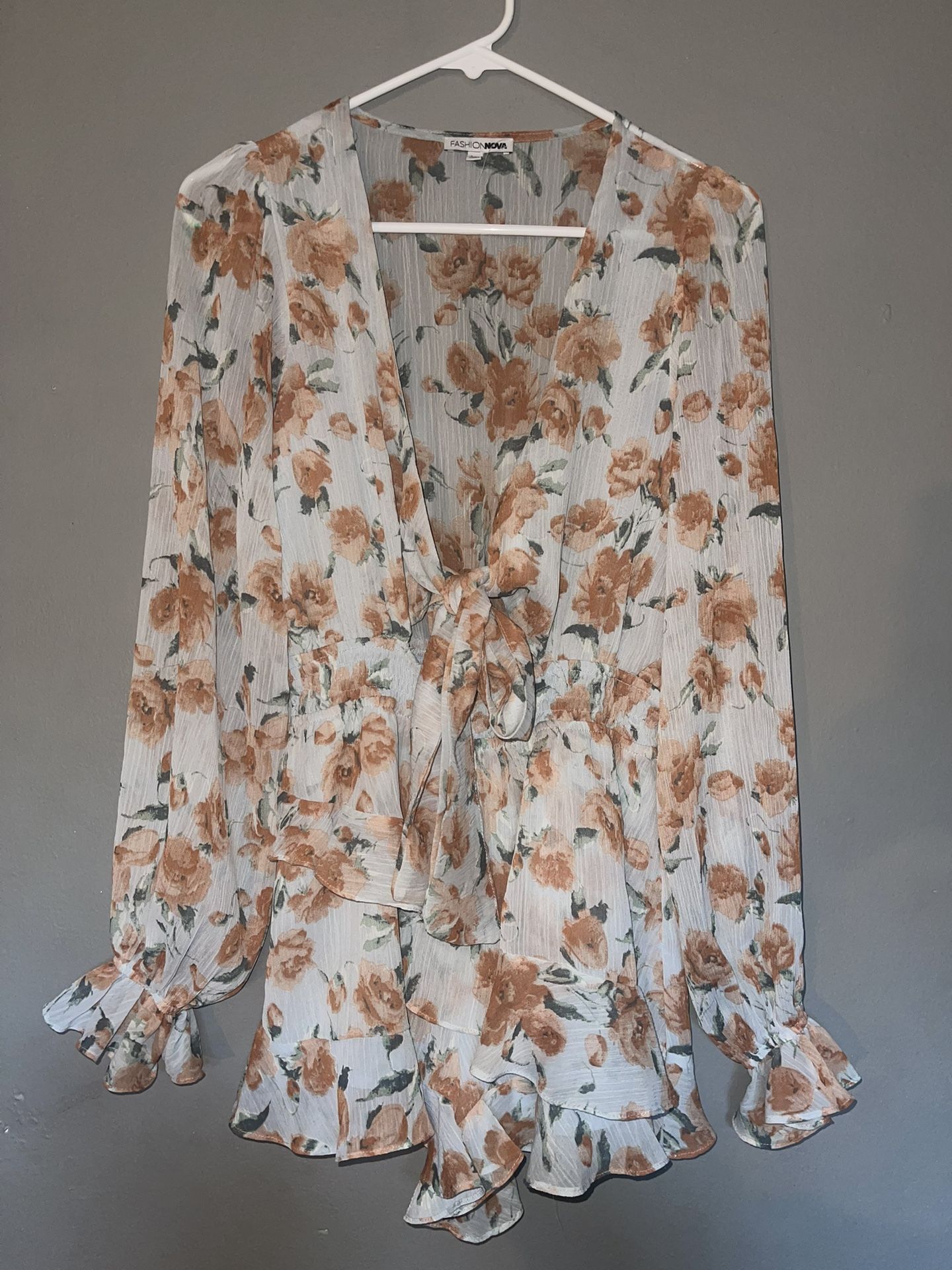 Chic floral romper with wrap design. Features long sleeves and flowy ruffle shorts. Perfect for stylish outings.