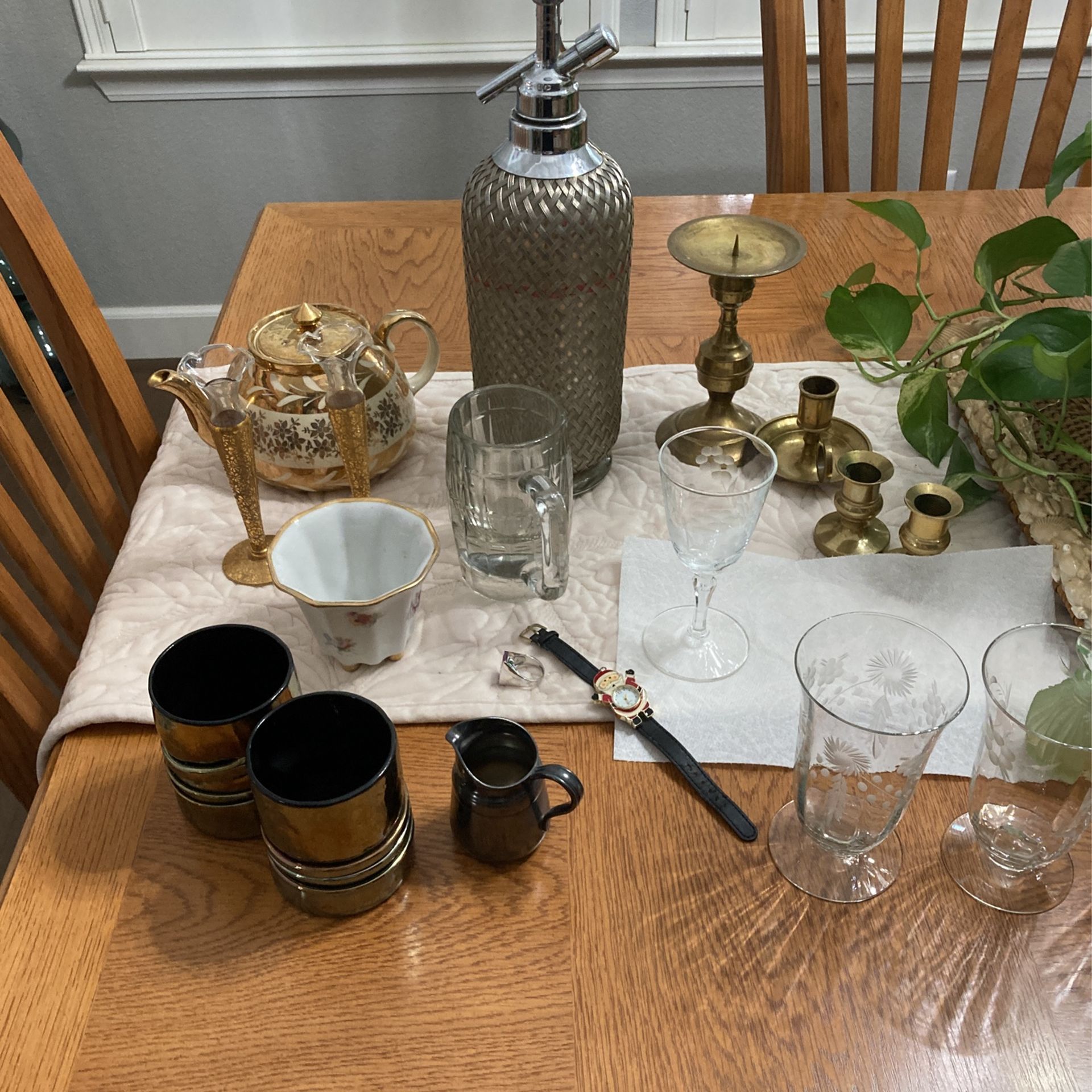 Fostoria Glassware Two Sets Misc Dishwater Silver Candlesticks Old Quilts. And More