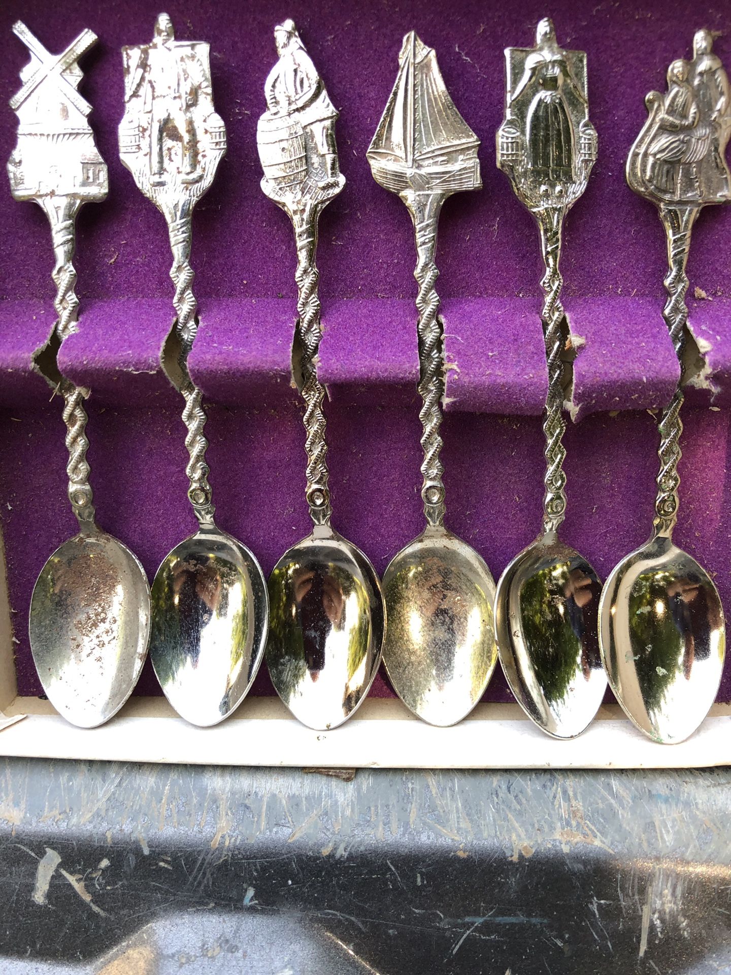 Nice little set of Dutch spoons depicting classic Holland stereotypes. Spoons are approximately 4 and a half inches long and in original bottom of box. Top missing. Some rusting as occurred but overall these are in good condition.