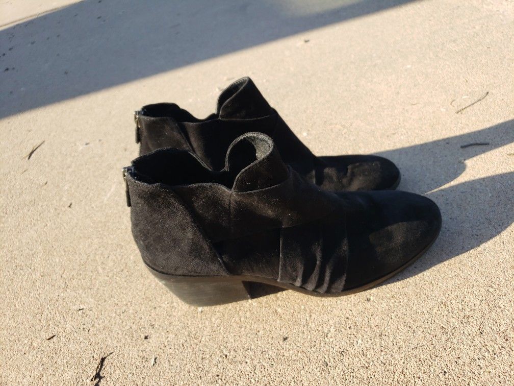 Eileen Fisher Vero Cuio Size 9 Women's Black Suede Boots - Brand New! Broad cross straps wrap the front of an open sided booties constructed of soft nubuck Size 9 Black Suede Boots With 2" Inch Wedge Heel With Zipper In Back! Description Supple, tumbled nubuck leather and graceful crisscross straps offer every-wear, any-hour booties to pair easily with a closetful of favorites. Man-made sole Back zip Almond toe Tumbled nubuck leather upper Leather lining Padded footbed Approximate 3" shaft height 2" stacked heel Leather sole; rubber heel cap Due to the inherent qualities of genuine leather, some subtle color variations will occur. Color is “black nubuck” but almost looks dark blue. Non smoking home Originally $260 Silver zipper in back Never worn; only tried on Eileen Fisher original Ankle Boots
