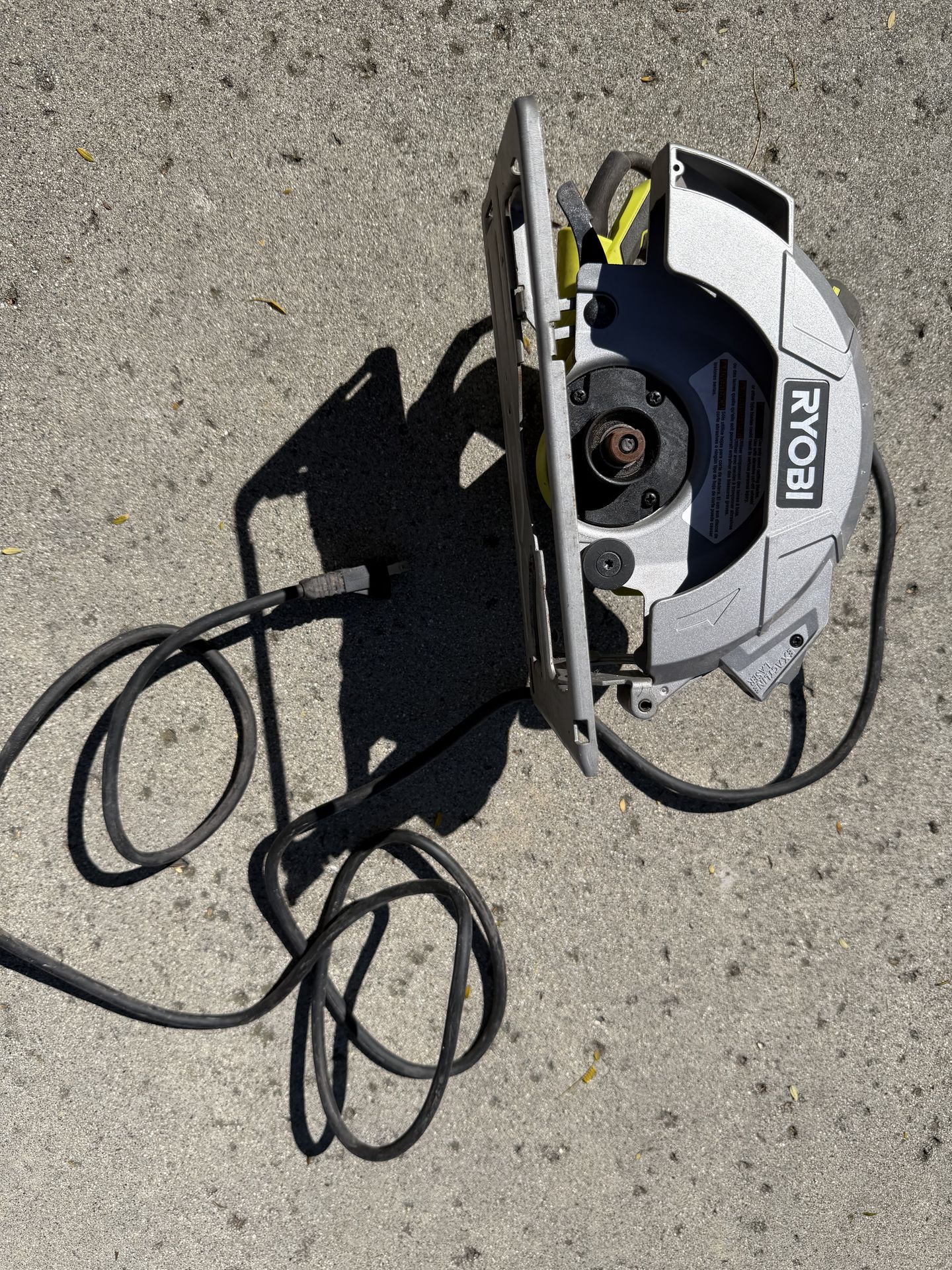 Ryobi Corded Circular Saw – No Blade – Great Backup Tool Reliable Ryobi corded circular saw in good working condition. No blade included — perfect for someone who already has blades or wants a solid backup saw for home projects. Details: • Corded electric (consistent power) • Ryobi brand • Clean, tested, works well • Blade not included • Great for DIY, cutting lumber, or as a dependable secondary saw This is a simple, sturdy tool that’s ideal to keep around for quick cuts or when you don’t want to drain your cordless batteries.