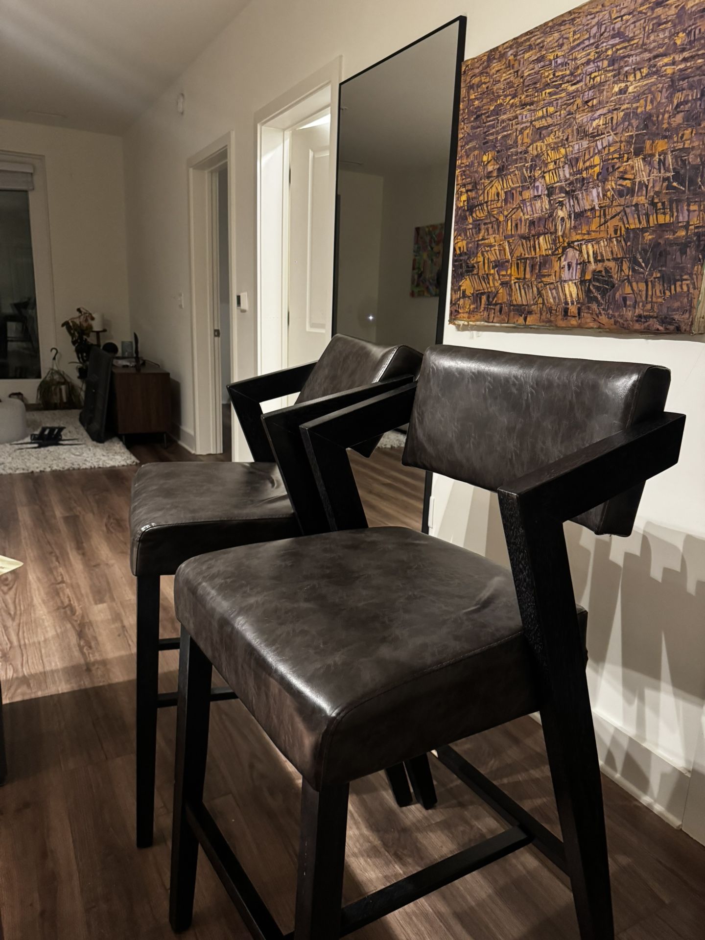 This Midcentury Modern inspired counter height stool features strikingly angular arms and a seat back that tilts -- offering customizable comfort to your guests. The reinforced footrest provides structural integrity and complements the geometric concept of this stool. Ideal at your counter height dining table or kitchen counter. Available in a rich Blackwash finish with charcoal faux leather upholstery. Online Listing: https://www.watsons.com/snyder-counter-height-bar-stool-blackwash-charcoal?srsltid=AfmBOooVWMMbCR9NMiEMdKMFrbe8ctnx6pbNCVPibqHo-T_WdOalxvqD