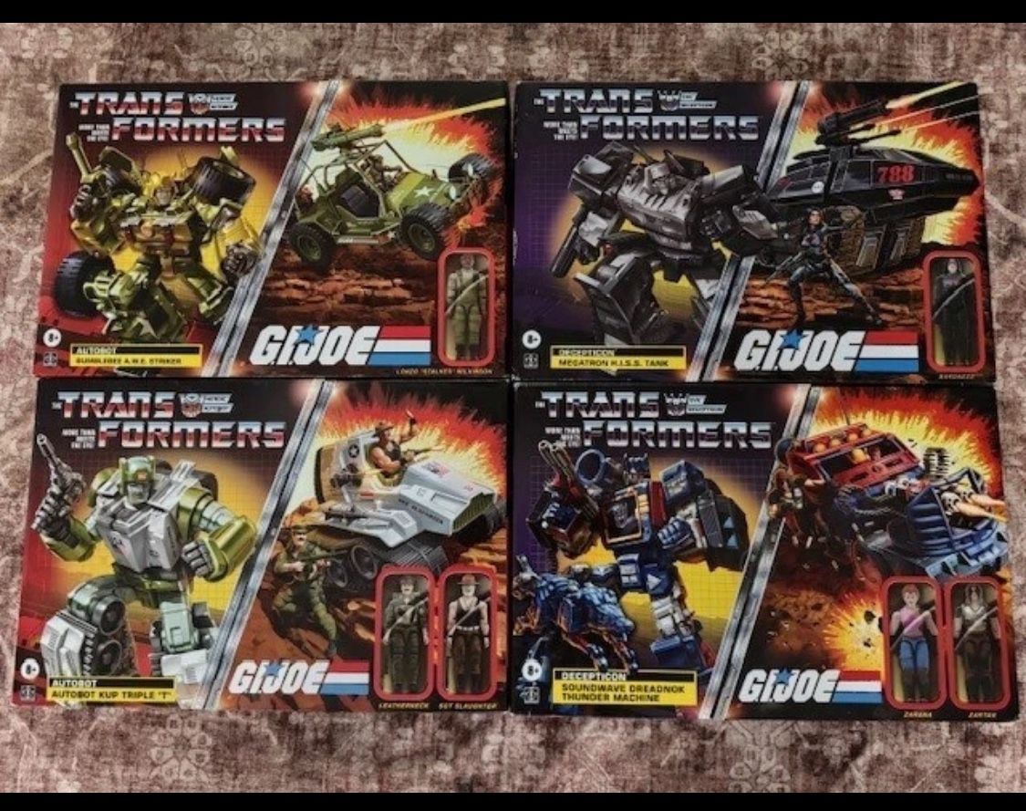 Greetings! For sale are new, factory sealed Transformer/GI Joe Crossover figures. The boxes have shelf wear from display, but are unopened and ready for your bids! Included: Bumblebee A.W.E. Striker Megatron H.I.S.S. Tank Kup Triple "T: Soundwave Dreadnok Thunder Machine