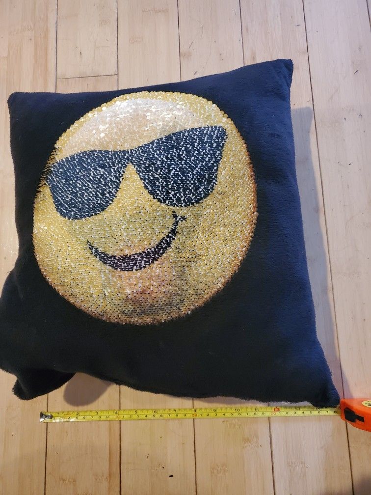 Black pillow with emoji decoration. Emoji is reversible for 2 different designs. Pillow seam needs sewing. Otherwise in good shape. Non-smoking home.