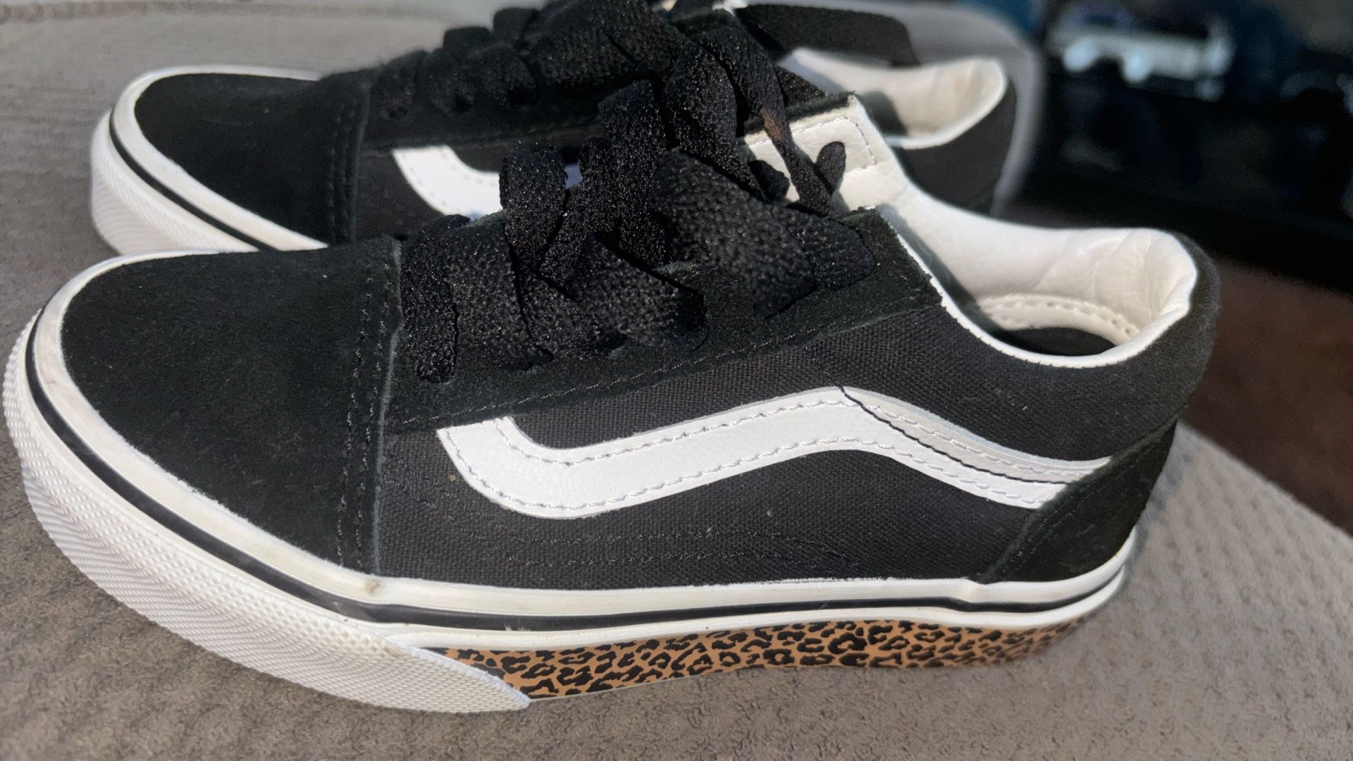 Brand new toddler vans old skool style with leopard/cheetah soles! Very very cute, sporty, swaggy Size is us kids 10.5 come get them today they must go! $35obo