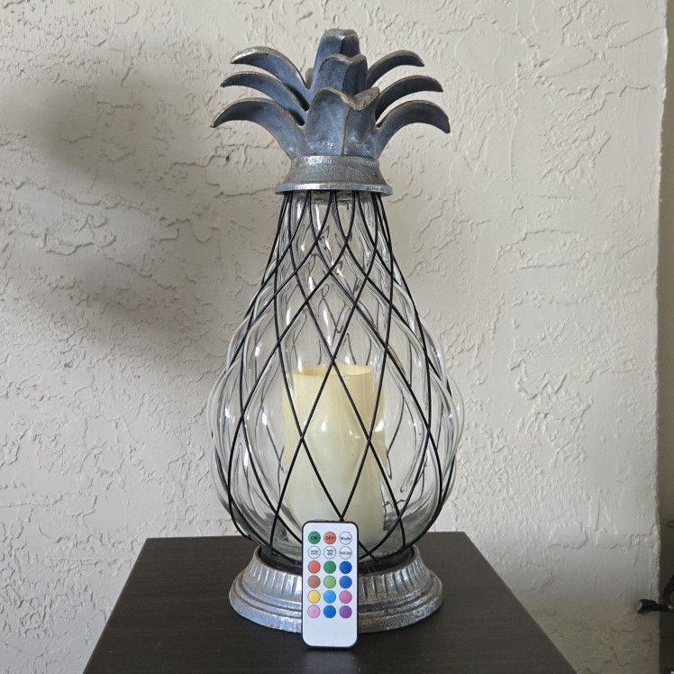 Bronze distressed metal & Blown Glass Pineapple Multi color light up battery operated. Requires disc battery in remote and 2 C batteries in pineapple. Great used condition. 17" height 7" base diameter Must pickup, make offer