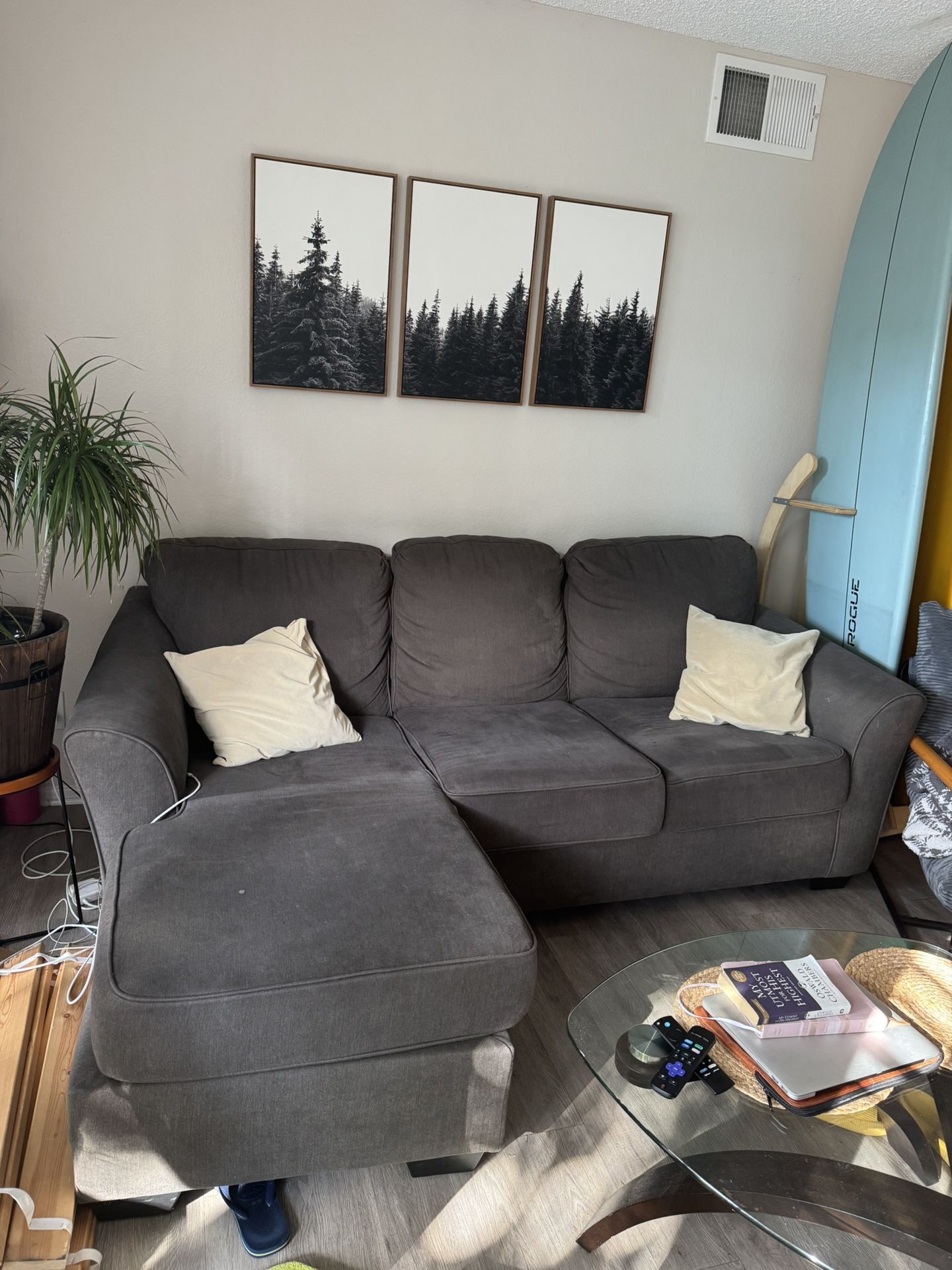 Pick up in Mira mesa Couch 85w 62d(chase) 36d(w/o chase) 28h Can make the chase go left or right. Removable cushion covers so you can wash. Super comfy. Best naps ever. Getting a bigger one now. Glass Coffee table we built but I guess we built wrong because one leg is not reaching the floor. We use coasters to keep it leveled but maybe you can figure out how it can be leveled. Yours for additional $20