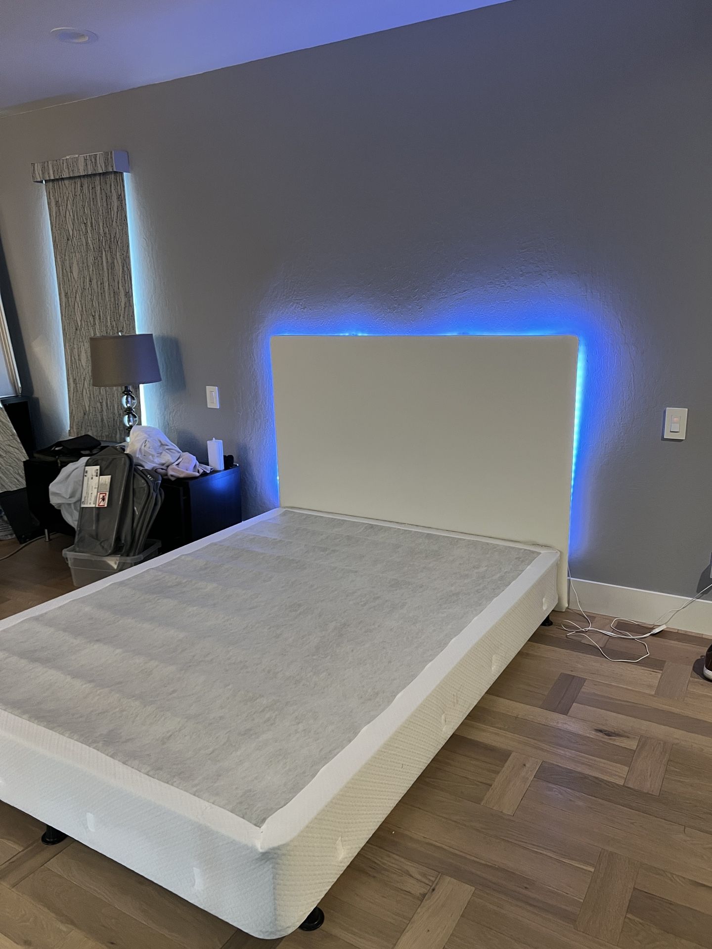 Beautiful queen bed with white faux leather and lighted headboard