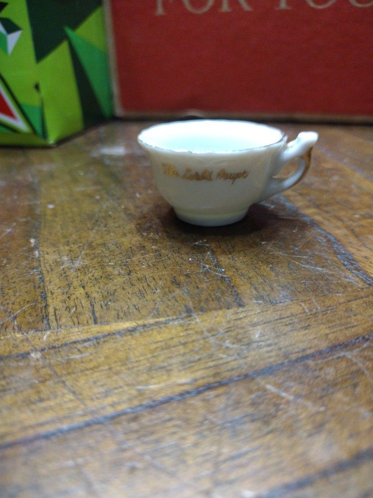 Brand Unknown This Miniature White Teacup with Gold Trim is Vintage A Very Pretty & Very Tiny Little Teacup that also says The Lord's Prayer in Gold Cursuf Writing A Great Little Collector's Item Very Unique & Very Rare to Find These Days A Beautiful & Great Find For Any Collector $2.75 OBO