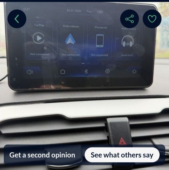 Portable Screen receiver for any car plugs into the cigarette plug in port of your vehicle. Compatible with iPhone android. Has mirror screen options as well. Many apps like YouTube Spotify Pandora Google maps ect. Can also listen to your music while using GPS. Good replacement for someone who doesn't have tunes and doesn't want to invest in audiosystem. Also has its option to use integrated speakers as well. On or off. Asking $80