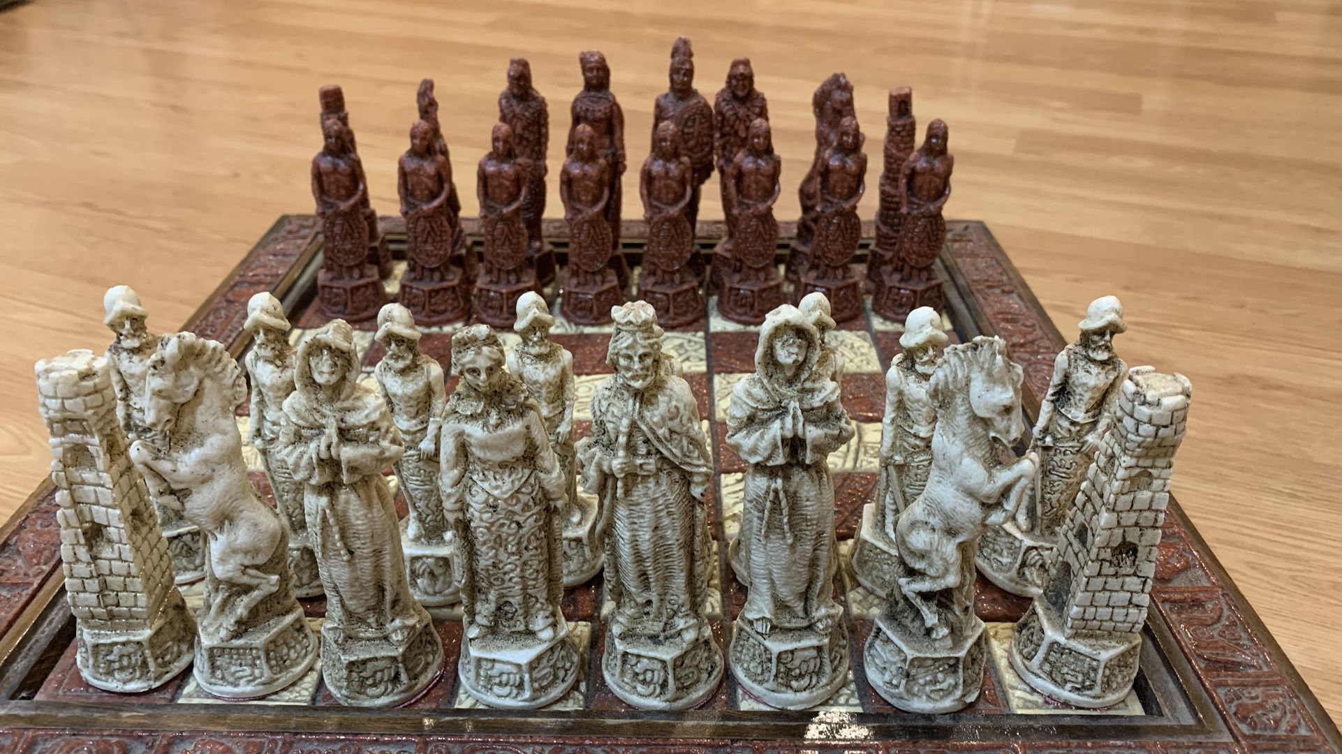 Antique Wood And Composite Stone Aztec Vs Conquistador Chess Set.