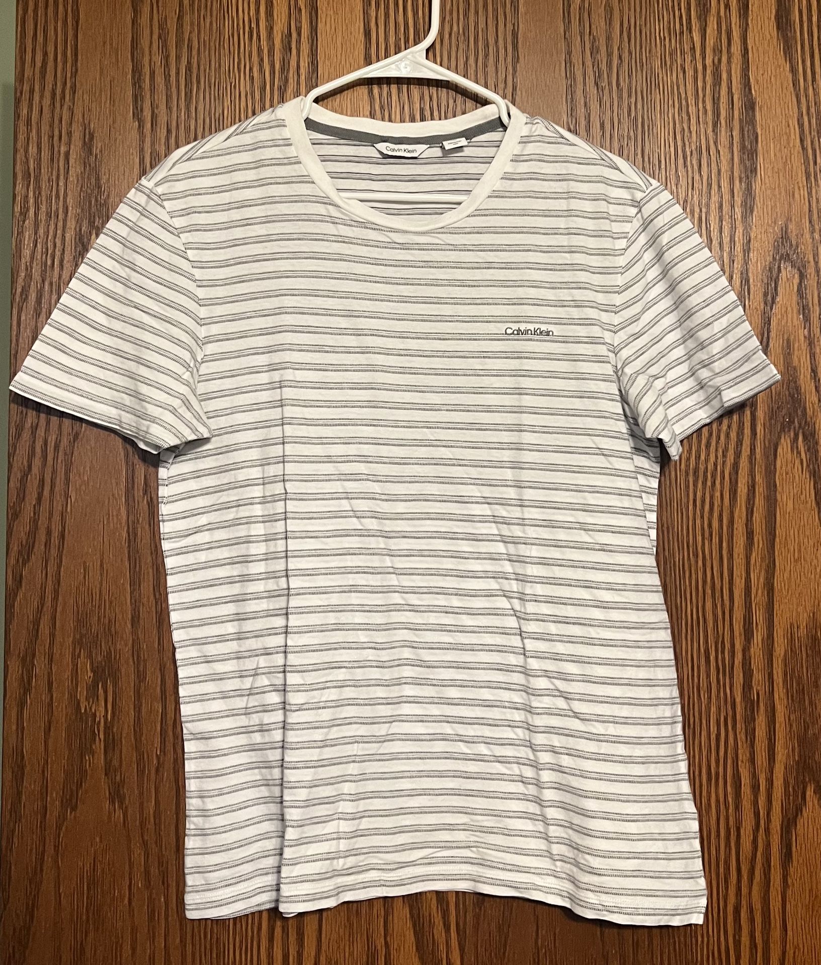 Mens size medium white tee shirt with tan stripes. Brand is Calvin Klein ✨ Check out my items, I bundle and trade ✨ ⚠️ SHIPPING NOTICE ⚠️ Shipped order prices will be slightly higher to cover platform fees. Not including shipping price