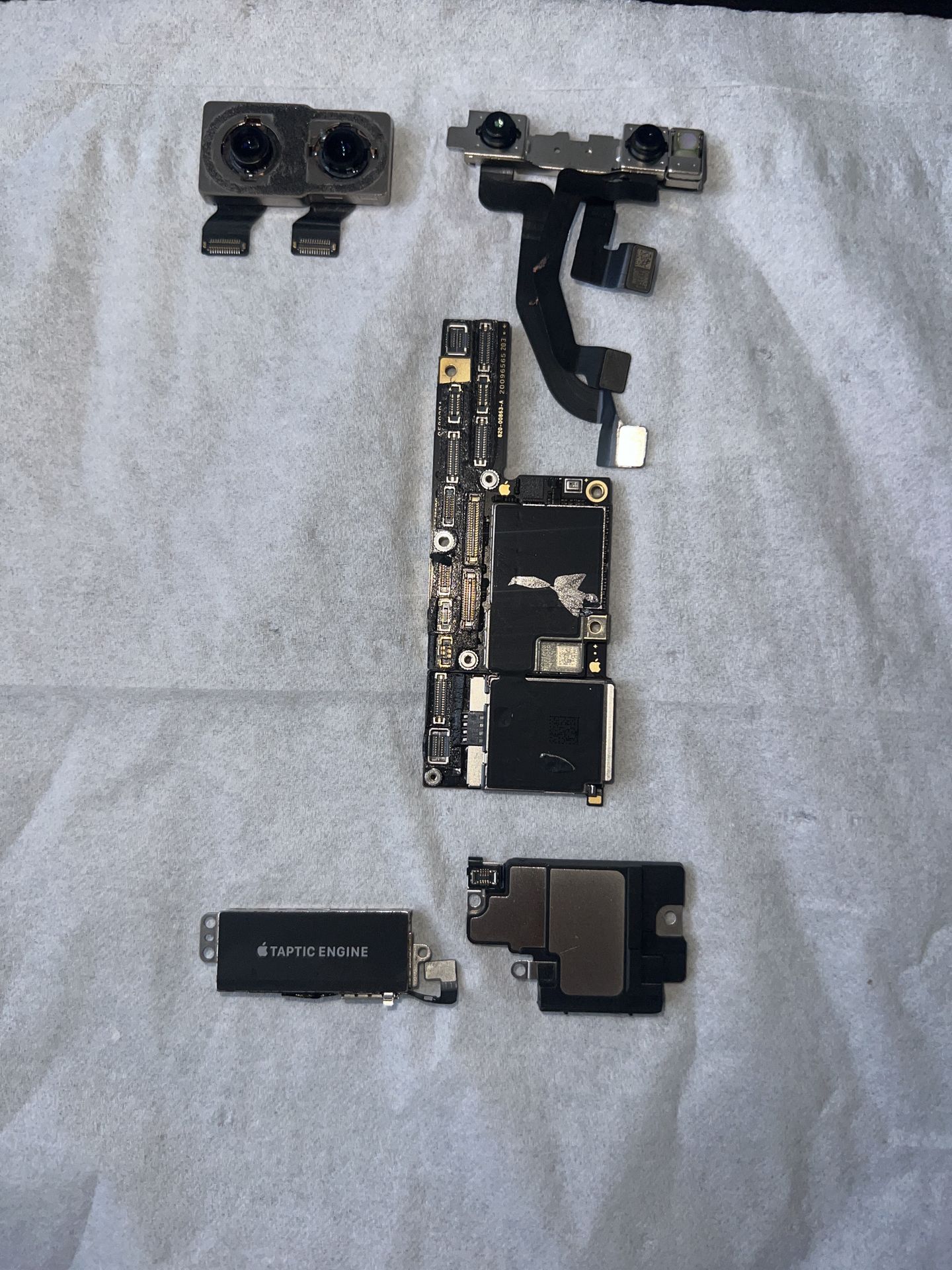 iPhone X parts lot. Includes logic board (iCloud locked), rear camera, front camera, charging port, loudspeaker, Taptic Engine, screen, and housing. Willing to sell individually: • Logic board (locked) – $20 • Rear camera – $15 • Front camera – $12 • Charging port – $12 • Speaker – $8 • Taptic Engine – $8 • Screen – $8 • Housing – $15 Bundle deal available. Message me.