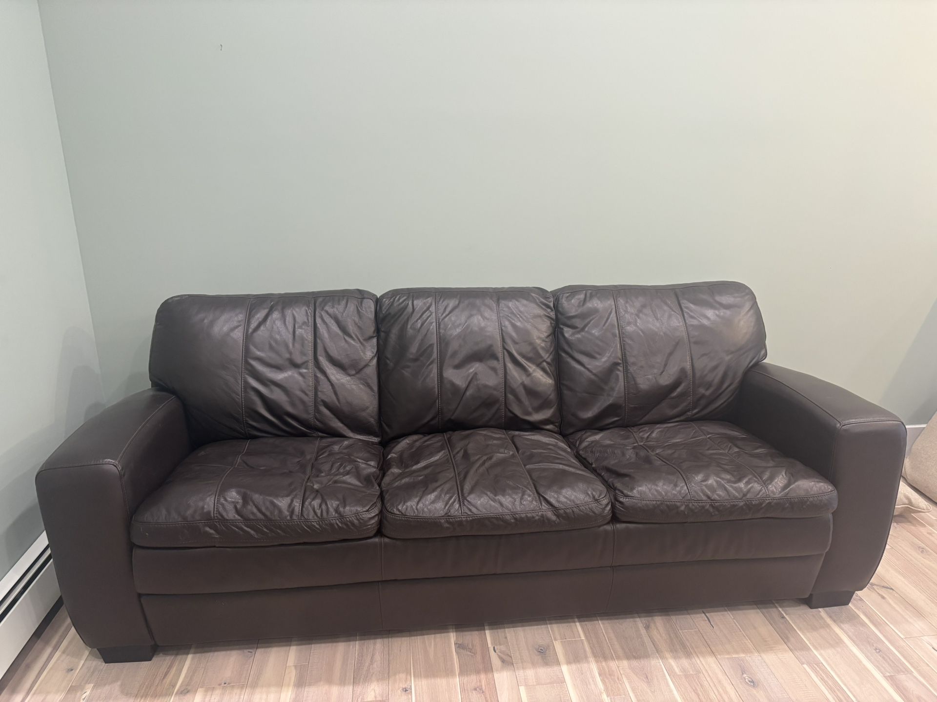 Brown genuine leather couch with queen mattress pullout. Very lightly used and with minimal markings. Queen mattress included! Dimensions: 7ft long x 34in deep x 32in tall
