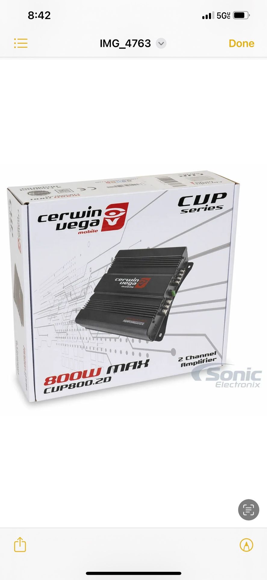 Amplifier Cerwin-Vega CVP800.2D CVP Series 400W 2-Channel Class-D Car Audio Conditions new pv83L Product highlights • 60 watts x 2 channel @ 4 ohms • 85 watts x 2 channel @ 2 ohms • Bridged: 180 watts x 1 channel @ 4 ohms • Total RMS Power: 180 watts • Class A/B 2 ohms Stable 2-Channel Amplifier Description Authorized dealer Product Details: • CVP Series Class A/B 2 ohms Stable 2-Channel Amplifier • RMS Power Rating: ◦ 4 ohms: 60 watts x 2 channel ◦ 2 ohms: 85 watts x 2 channel ◦ Bridged: 180 watts x 1 channel @ 4 ohms • Total power output: 180 watts • LED Power/Protect Light • Speaker-level (high-level) inputs • 1 pair of pre-amp outputs • Signal sensing remote turn-on • 3-way protection circuitry (thermal, overload, and speaker short protection) • Input sensitivity: ◦ Low level: 200mV - 6 volts ◦ High level: 200mV - 6 volts • Total Harmonic Distortion (THD): <1% • Signal to Noise Ratio: >90 dB • Variable high-pass filter: 40 - 400 Hz • Variable low-pass filter: 40 - 400 Hz • Variable Bass Boost: 0 - 12 dB • Fuse Rating: 30A • 4 AWG gauge amplifier wiring kit is recommended for installation • Dimensions: 9.38" L x 7.88" W x 2.25" H • Authorized Internet Dealer • Specifications & Details Key Features Amplifier Key Features Bass Boost • Speaker Level Inputs Power Specifications - Full Range Channels RMS Power @ 4 ohms 60 watts x 2 channel RMS Power @ 2 ohms 85 watts x 2 channel Bridged RMS Power 180 watts x 1 channel Amplifier Specifications Series CVP Series Amplifier Class A/B Number of Channels 2-Channel Total Peak Power Output 800 watts Total RMS Power Output 180 watts Maximum Input Gauge Size 4 AWG Minimum Impedance Unbridged 2 ohms Minimum Impedance Bridged 4 ohms THD at Rated RMS Power <1% Speaker Level Inputs Yes Preamp Outputs 1 pair Built-in Crossover Low-Pass (LP) • High-Pass (HP) • Full (AP) High-Pass Crossover Frequency 40 - 400 Hz Low-Pass Crossover Frequency 40 - 400 Hz Signal-to-Noise Ratio >90 dB Bass Boost 0 - 12 dB Remote bass/level controller No Fuse Rating 30A x 1 Total Fuse Rating 30 Strappable No Sonic Certified Amplifier Yes Amp Bluetooth Connectivity No Hi-Res Certified No Low-Level Input Sensitivity 200mV - 6 volts High-Level Input Sensitivity 200mV - 6 volts