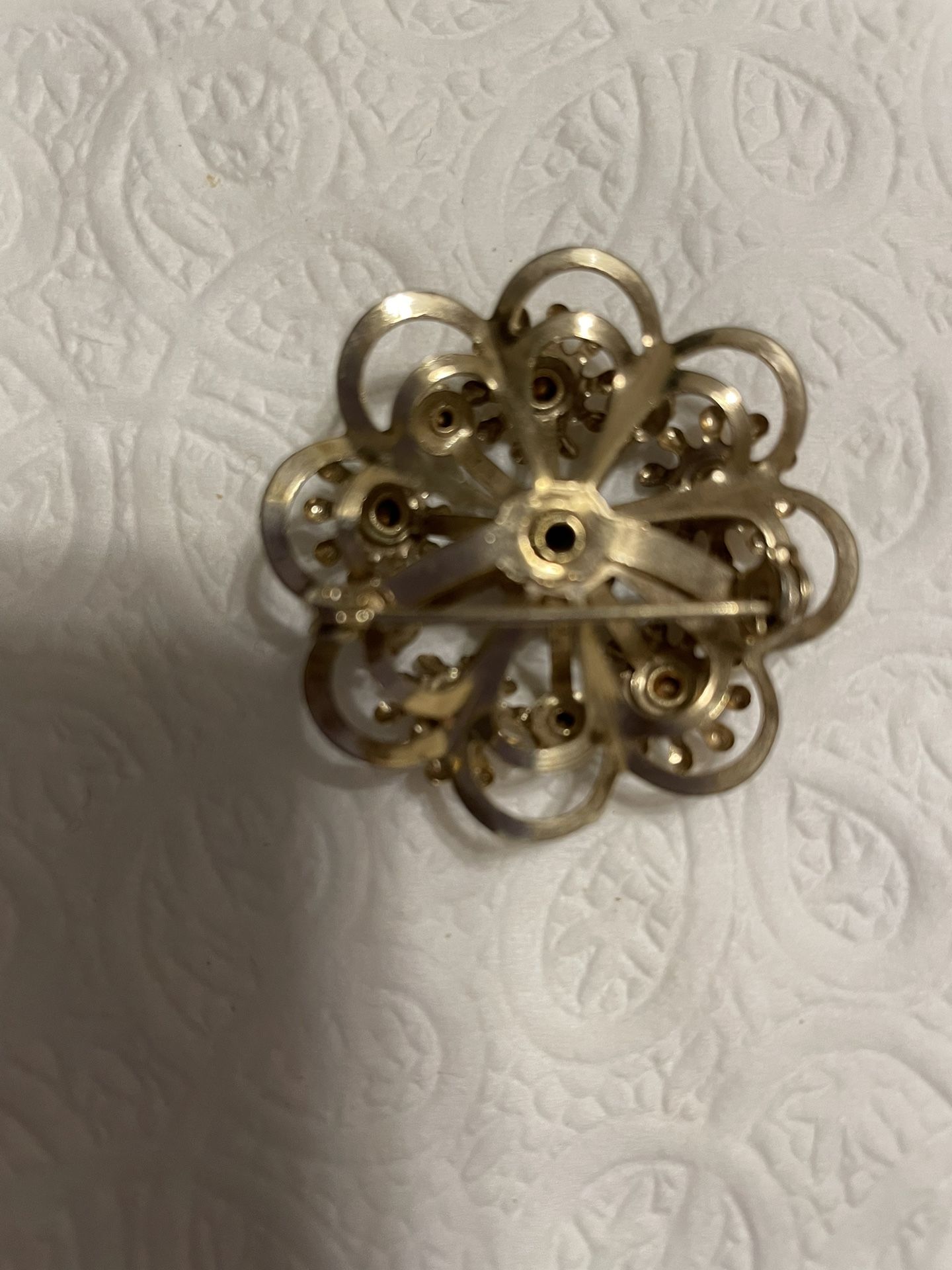 Beautiful gold colored pin with garnet colored rhinestones