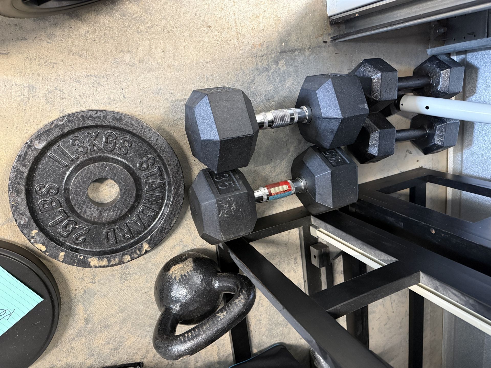 Home gym weight bundle in good condition. Includes: • Pair of 35 lb rubber hex dumbbells • Pair of smaller hex dumbbells • Two 25 lb standard weight plates • Cast iron kettlebell Great starter set for a home gym or garage workout setup. Pickup near Mount Holly Huntersville Rd & Brookshire Blvd. Cash or Venmo at pickup.