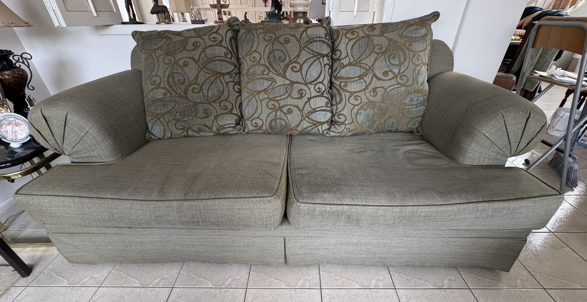Comfortable green sofa with decorative patterned cushions. 84”Wx44”Dx42”H Sofa