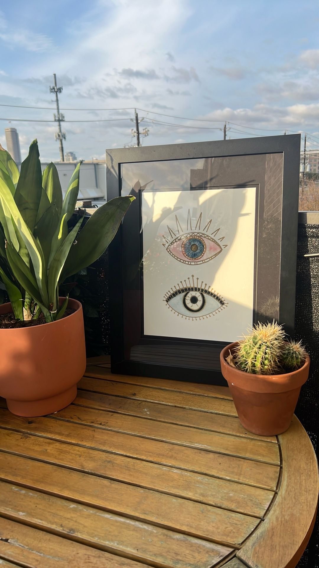 Stylish framed art print featuring two symbolic eyes with gold detailing. Modern, mystical, and minimal — great for gallery walls, offices, or bedrooms. Black frame included and ready to hang. Pickup preferred.