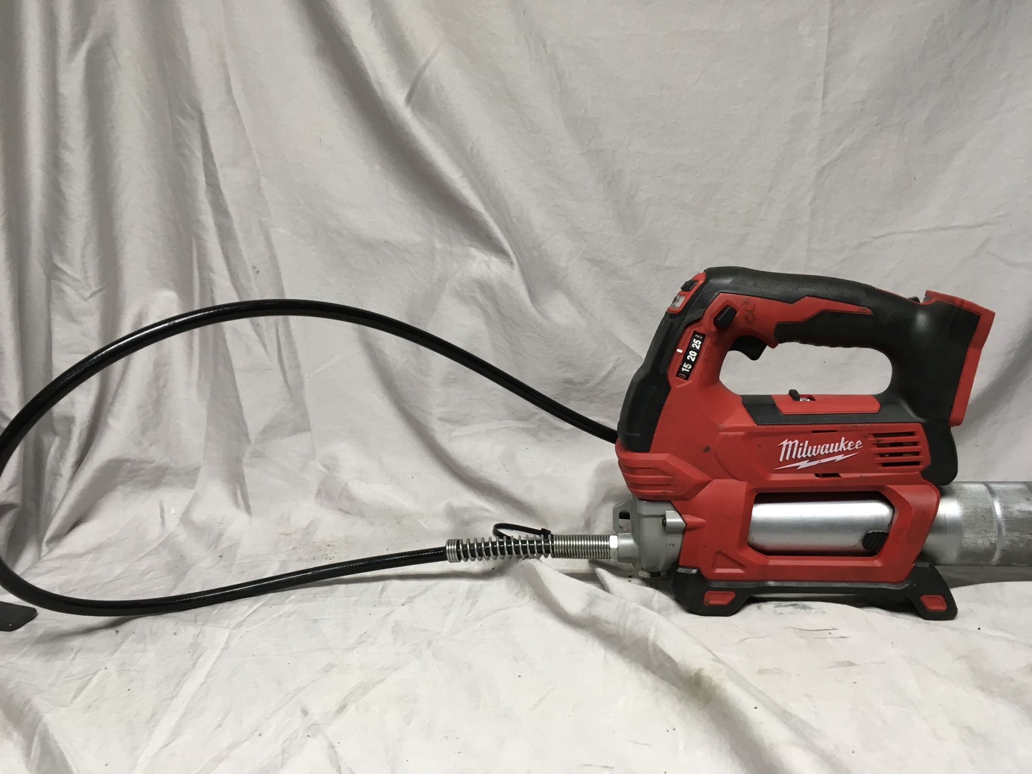 Milwaukee 18 volt cordless grease gun no battery no charger The M18 Cordless 2-Speed Grease Gun delivers maximum pressure and unmatched versatility, offering an industry leading 10,000 PSI max operating pressure and a patent pending pre-set grease counter that allows service and maintenance professionals to dispense precise amounts of grease. The tool's 2-speed design offers users the ability to select between max pressure and max flow rate. Other unique features include an on-board LED light, a lock-on/lock-off trigger, and a plunger rod with markings to gauge how much grease is left in the barrel. The tool's stand up design and shoulder strap capability offer user convenience, while limiting fatigue and the 48" flexible hose offers greater accessibility when greasing hard to reach fittings. Powered by an M18 REDLITHIUM Battery pack, this is the industry's only 18V grease gun that's battery is compatible with a system of tools. Model 2646-20 Located at 5 Mile Pawnbrokers, 8610 Washington Blvd #116, Jessup, MD 20794 Please call or stop by if interested (contact info removed) Open from 10-7 Monday-Friday 10-6 Saturday PRICES ARE NEGOTIABLE DO NOT EMAIL