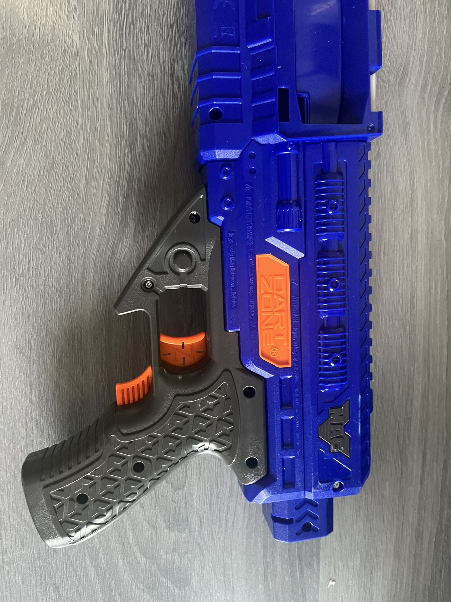 Dart Zone Villainator blaster in bold blue and orange colors. Lightweight, easy to grip, and built for fast-paced dart battles. Works with standard Dart Zone darts. Blaster only – no darts or accessories included.