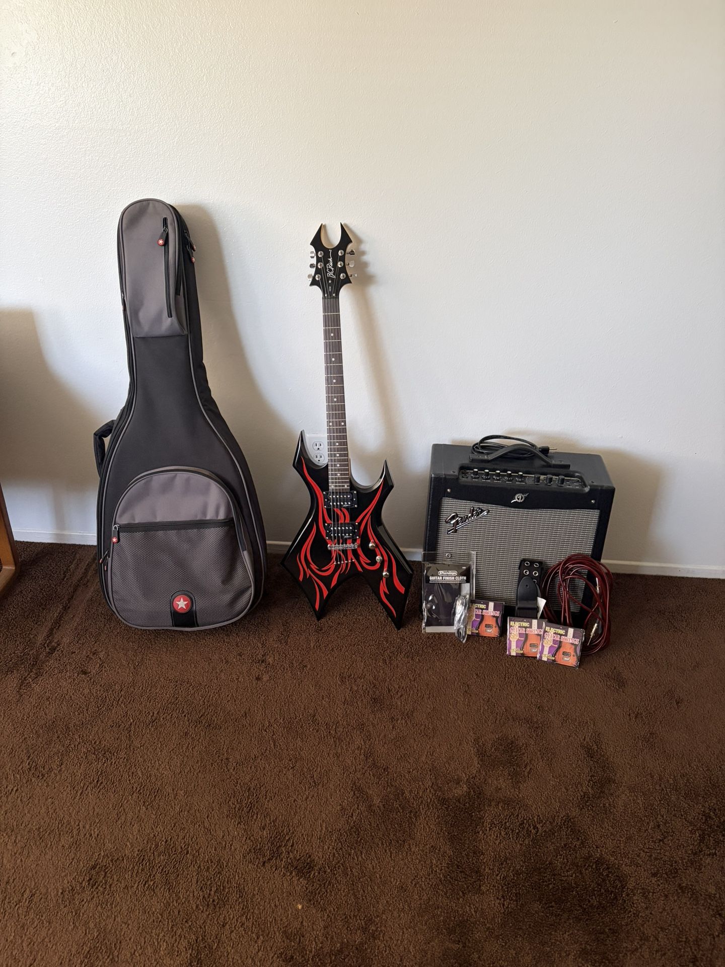 Electric Guitar Bundle 1 B.C. Rich Kerry King Master Warlock Electric Guitar (Never Used, Excellent Condition) 1 Road Runner Boulevard II series parlor acoustic guitar gig bag (Excellent Condition) 1 Fender Mustang II v.2 40 watt 1x12 amplifier (Excellent Condition) + accessories $650 for bundle as shown in photos Pick up in Orange, CA Cash Only