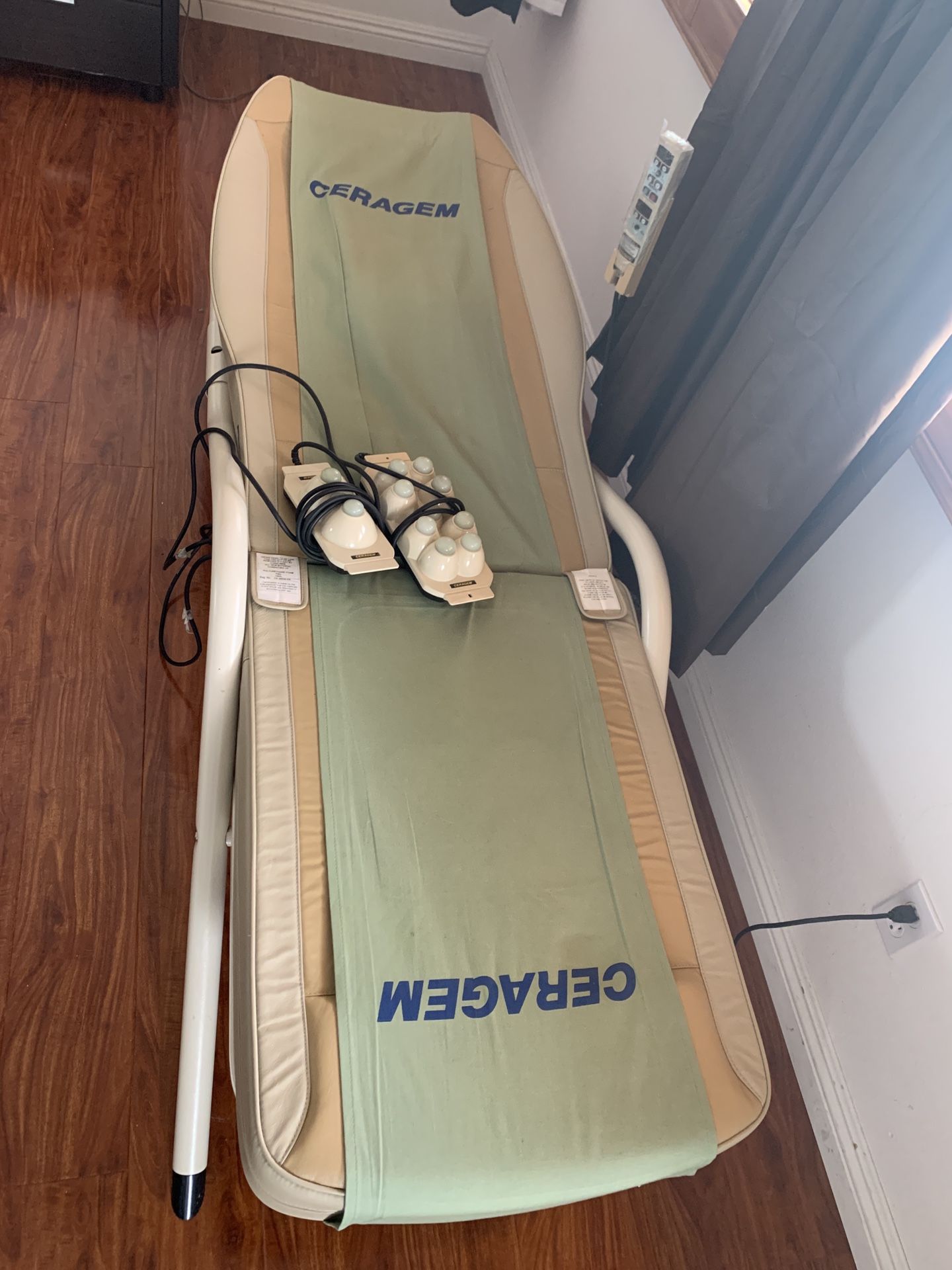 Relaxing Ceragem automatic thermal massage bed. Has a remote control still in plastic and two handheld massagers. The bed is beige and tan with a green mat.,everything is fine still like a new massage bed.(Made in Kore)