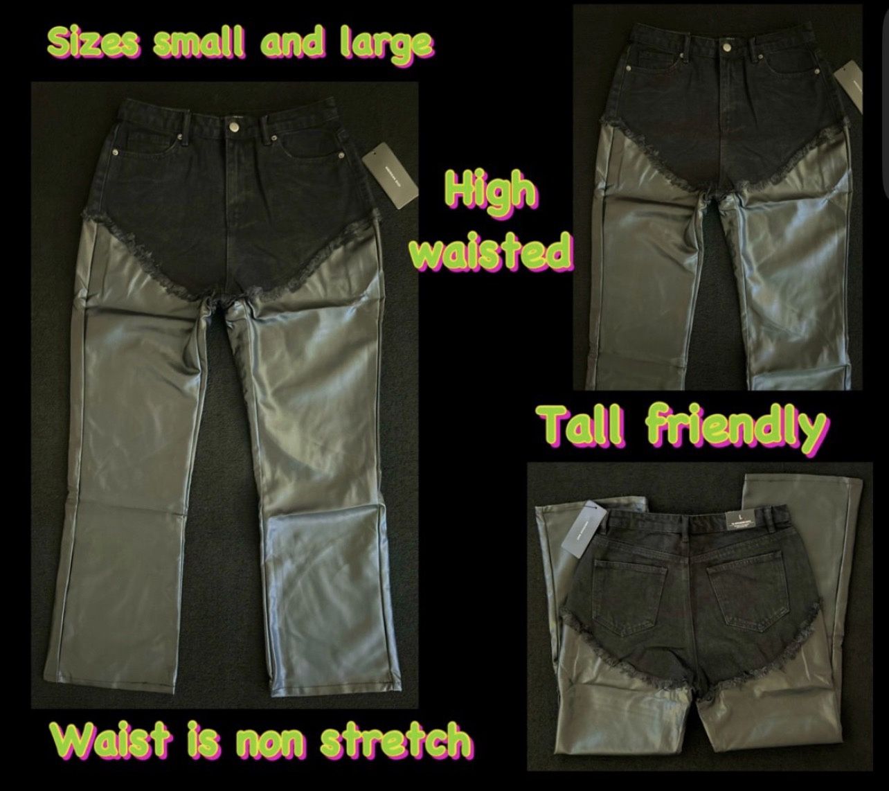 Available in sizes small and large. Tall friendly, made with Jean and pleather.