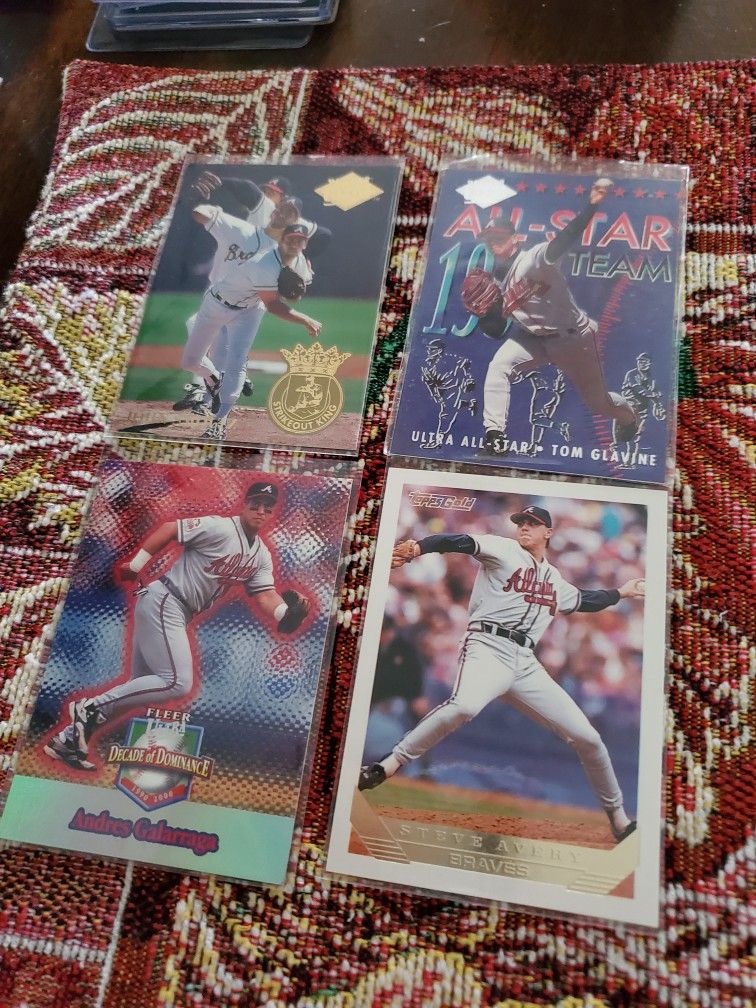 Atlanta Braves inserts and Parallels Baseball Cards Lot '98 Topps New Breed Andruw Jones '98 Fleer Ultra Notables Andruw Jones '97 Upper Deck Predictor Andruw Jones '94 Fleer Ultra Strikeout Kings John Smoltz '94 Fleer Ultra All-star Team Tom Glavine 01 Fleer Ultra Decade Of Dominance Andres Galarraga 09 Upper Deck O-Pee Chee Preview John Smoltz 06 Upper Deck First Pitch Diamond Stars John Smoltz '92 Pinnacle Team 2000 John Smoltz '94 Fleer Ultra All-star Team David Justice 08 Topps 50th Anniversary 1990 topps All-star Rookie Outfielders David Justice '92 Upper Deck Ted Williams Best Hitters David Justice '10 Topps Peak Performer Brian McCann '10 Topps 206 No number short print Brian McCann 08 Topps Allen and Ginters U.S State Card Mark Teixeira 06 Fleer Star of tomorrow Jeff Francoeur 06 Topps Sports Illustraded For Kids Max Action Marcus Giles 2010 Topps Peak Performer Jason Heyward '11 Topps Spot the Error Jason Heyward '92 Upper Deck Homerun Heroes Terry Pendleton '93 Fleer All-stars Terry Pendleton '89 Topps Super Star Sticker Ozzie Virgil '95 Fleer Pro Vision Greg Maddux '92 Upper Deck Home Run Heroes Ron Gant '13 Topps Update Chasing History Justin Upton '93 Topps Gold Parallel Steve Avery 09 Upper Deck O-Pee Chee B-Border Parallel Garret Anderson 03 Topps Update Gold Parallel Adam Stern Rookie '93 Topps Stadium Club 1st day issue Kent Mercker '93 Topps Gold Parallel Charlie Leibrandt '92 Leaf Gold Parallel Greg Olson those are in NM Condition Cards will come in Penny Sleeves only