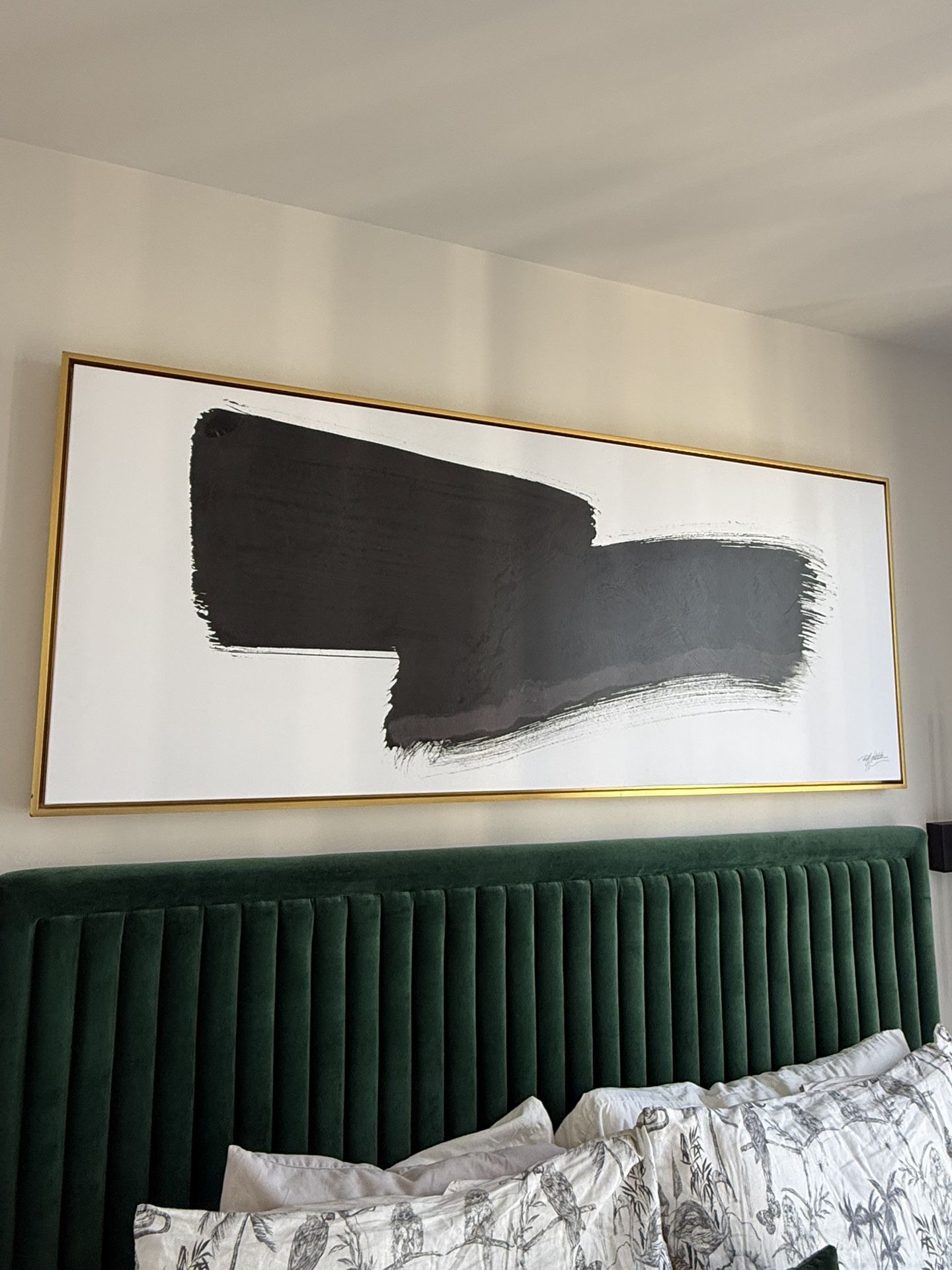 Stunning oversized abstract artwork with bold black/charcoal brushstrokes on a white canvas, professionally framed in a sleek gold frame. Very modern, high-end look—perfect for a living room, bedroom, office, or luxury apartment. • Dimensions: 31.5” H x 76.5” W • Good condition (minor scratches on frame from moves) • Statement piece – fills a large wall beautifully Asking $200 – open to reasonable offers. Pickup available in Downtown Miami with easy loading dock + elevator for stress-free transport.