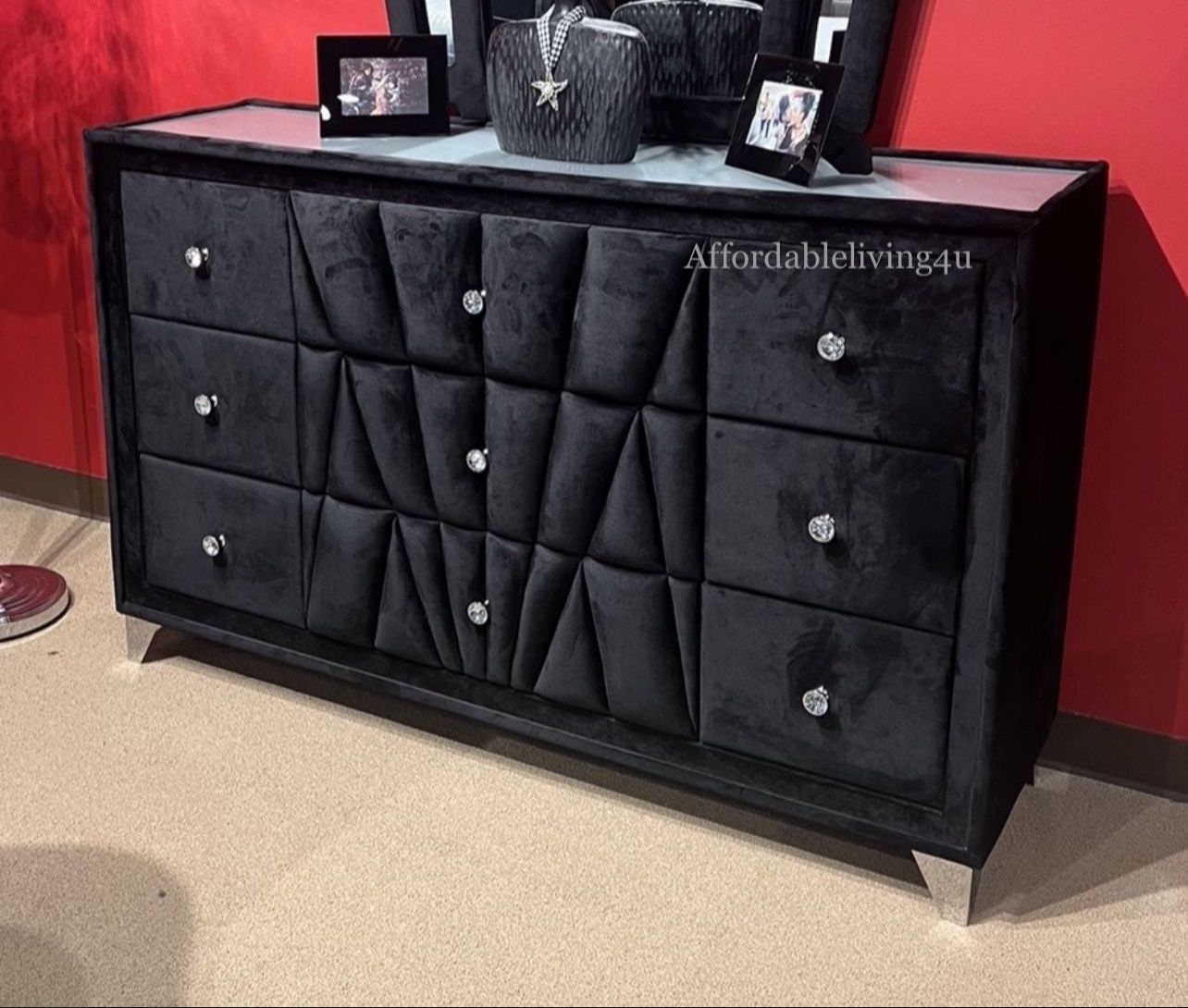 Black Velvet Dresser W/ Acrylic Crystal Knobs Brand New In Box