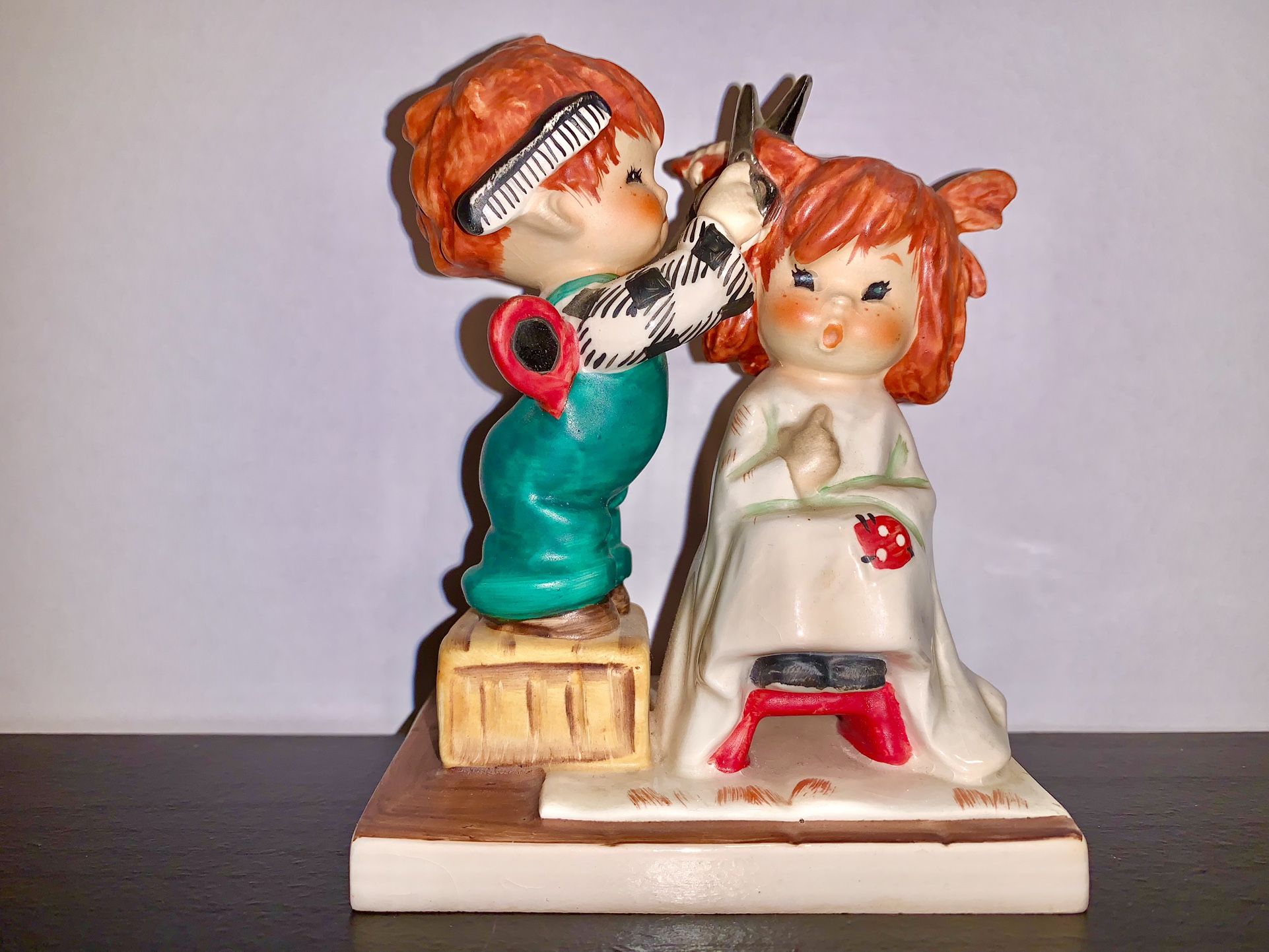 This is such a sweet collectible figurine that was made by Charlot Byj in West Germany. The vintage figurine is of a red-headed boy giving a red-headed girl a haircut. Its title is "Shear Nonsense". It measures just about 5" tall and is in great condition, with no chips, cracks, or crazing.