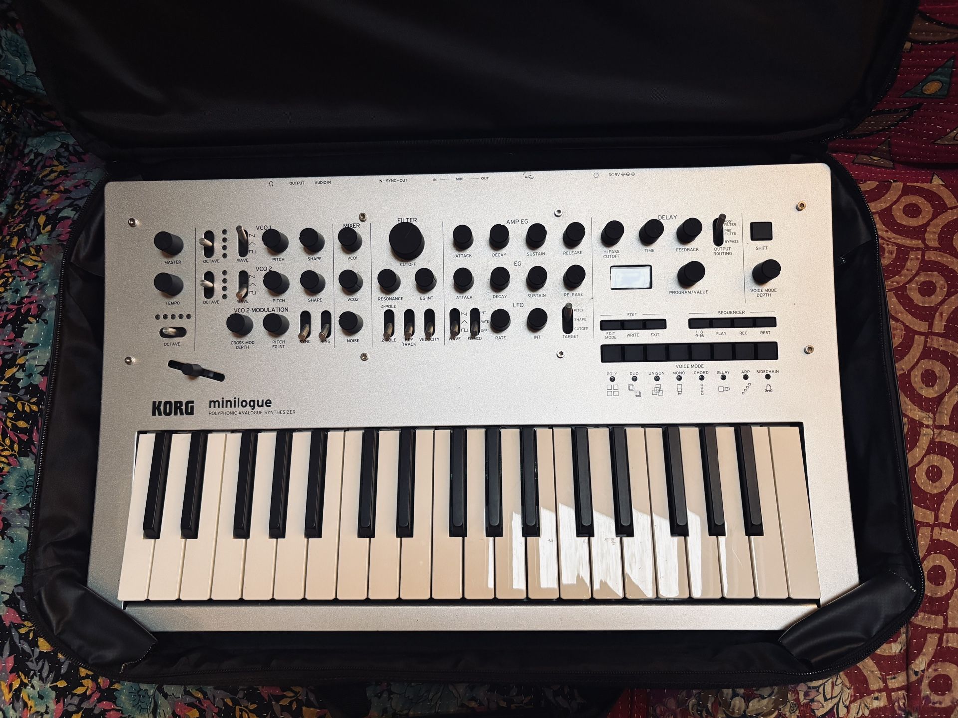 Gently used synth. Comes with soft storage bag (pictured) as well as new-in-packaging clear plastic dust cover (not pictured). Synth alone retails for $700. Bag and cover adds another $200+ to value. Asking $550 for synth plus described accessories. From manufacturer: “The Korg minilogue Polyphonic Analog Synthesizer is a revolutionary new instrument fusing classic analog tone with cutting edge features. This polyphonic analog synthesizer offers four voice analog sound with 37 full size keys, designed for live performance and studio use. The minilogue's analog signal path features two VCOs, a VCF, and a VCA to provide a classic analog sound with warmth and character. The minilogue combines vintage appeal with modern connectivity, including MIDI, USB and CV/Gate inputs and outputs for synchronizing with drum machines and sequencers.”
