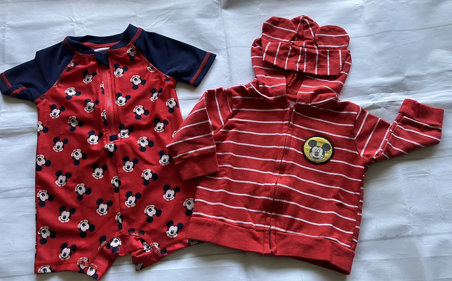 In good condition boys Mickey Mouse one/pc swimsuit w/hoodie. SZ6-9M
